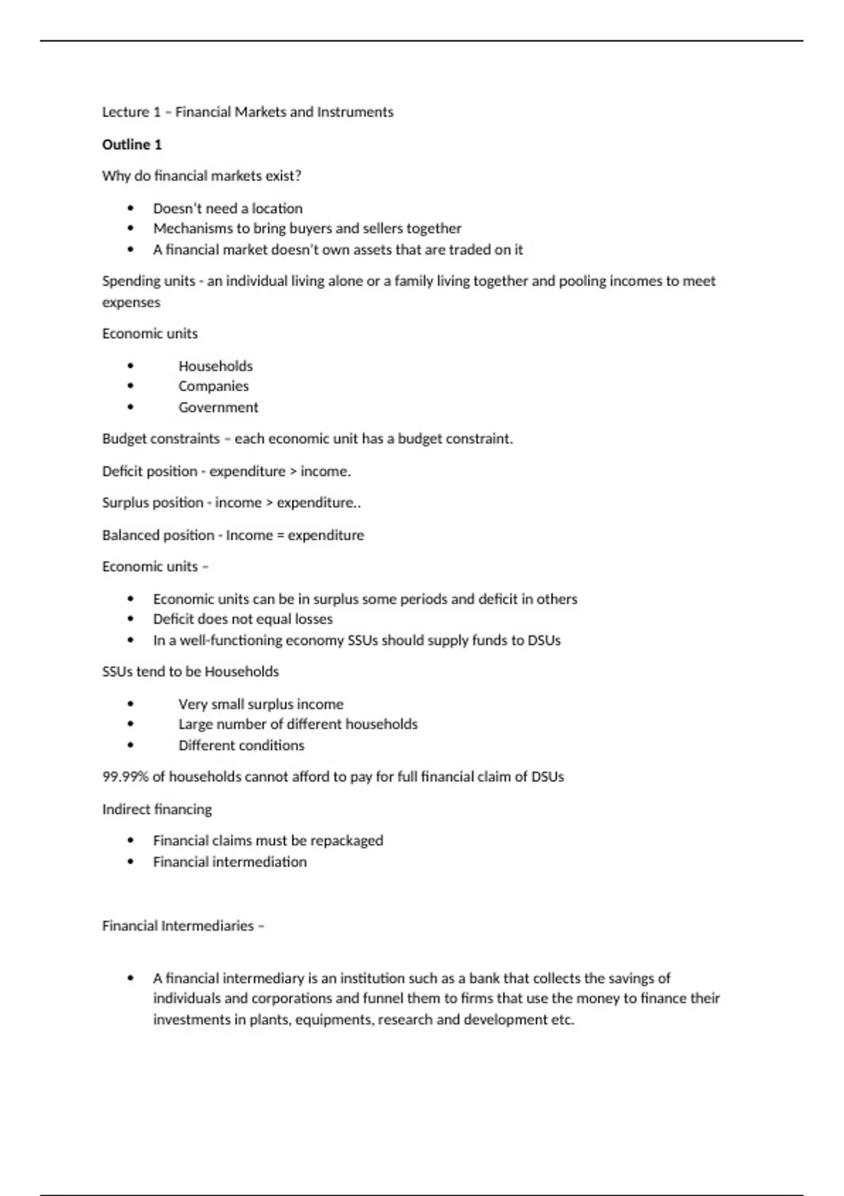 Summary Lecture 1, Outline 1 – Financial Markets and Instruments