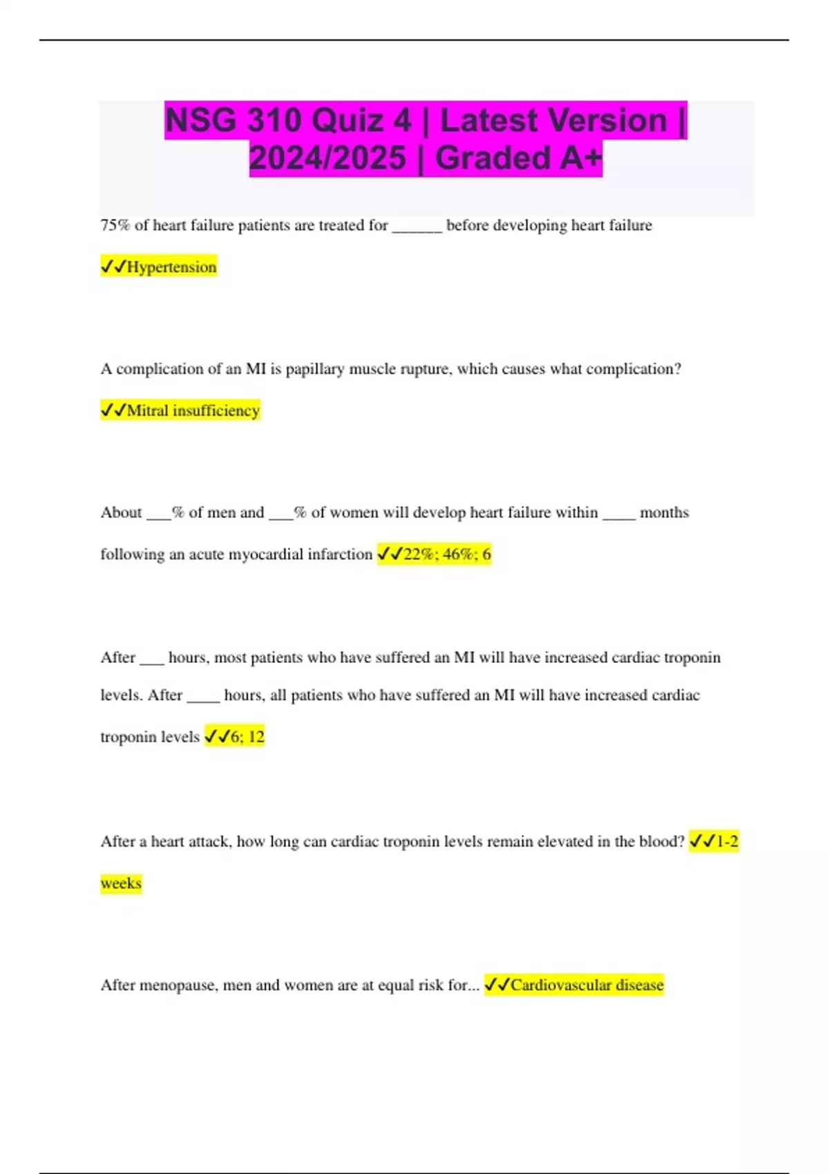 NSG 310 Quiz 4 | Latest Version | 2024/2025 | Graded A+ 75% of heart failure patients are treated for ______ before developing heart failure Hypertension A complication of an MI is papillary muscle rupture, which causes what complication? Mitral insufficiency About ___% of men and ___% of women will develop heart failure within ____ months following an acute myocardial infarction 22%; 46%; 6 After ___ hours, most patients who have suffered an MI will have increased cardiac troponin levels. After ____ hours, all patients who have suffered an MI will have increased cardiac troponin levels 6; 12 After a heart attack, how long can cardiac troponin levels remain elevated in the blood? 1-2 weeks After menopause, men and women are at equal risk for... Cardiovascular disease Afterload describes the resistance exerted by the pressure within the ____ against the ____ (HTN) Aorta; left ventricle An MI to the ventricle can causes ventricular tachycardia. This is often a precursor to... Ventricular fibrillation As with unstable angina, what does a change in pain pattern indicate? New regions of the heart are undergoing myocardial ischemia Classic cardiac chest pain / retrosternal chest discomfort is often described as... Pressure, squeezing, choking, or heaviness on the chest Do preload factors affect cardiac output before or after contraction? Before contraction During a myocardial infarction, the ____ the blockage, the better the blood flow to the majority of the heart Lower During an assessment of a patient with chest pain, the nurse recognizes that chest pain is associated with angina is: A. Always sudden in onset and is accompanied by a feeling of doom B. Usually precipitated by stress and relieved by rest C. Aggravated by inspiration, coughing, and movement of the upper body D. Accompanied by a residual soreness in the chest that lasts for several days B. Usually precipitated by stress and relieved by rest