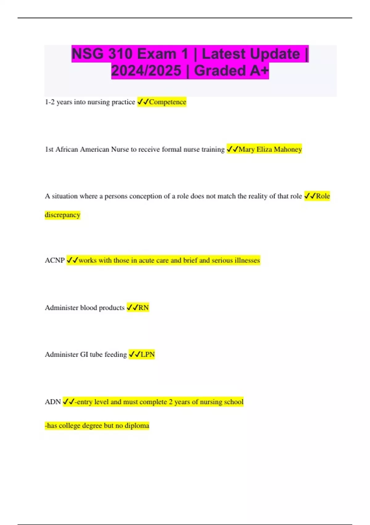 NSG 310 Exam 1 | Latest Update | 2024/2025 | Graded A+ 1-2 years into nursing practice Competence 1st African American Nurse to receive formal nurse training Mary Eliza Mahoney A situation where a persons conception of a role does not match the reality of that role Role discrepancy ACNP works with those in acute care and brief and serious illnesses Administer blood products RN Administer GI tube feeding LPN ADN -entry level and must complete 2 years of nursing school -has college degree but no diploma -created due to a nursing shortage -lacks the education/knowledge/critical thinking/leadership and cultural understanding of a BSN Advanced Beginner -understands basic elements of practice and organize/prioritize clincal tasks -only partially grasps each pt situation -1-18months American Red Cross Jane Delano-helped fix nursing shortage by supplying nurses in war ANA American Nurse Association -represents interest of RN -forefront for improving healthcare for all -high standards of nursing practice promotes safe and ethical nursing environment ANCC American Nurses Credentialing Center -sub of ANA -certifies and recognizes nurses in specialty practice areas AONE American Organization of Nurse Executives -designs, facilitates, and manages care -provides vision and actions for nursing leadership to meet healthcare needs of society -develop nursing leaders Are of law that provides a civil remedy when someones words end up causing harm to your reputation or your livelihood Defamation Argued that the nursing boards in each state were weak and insufficient -directed the first independent nursing collegiate school Annie Goodrich Assembles Superintendants -raised requirements and standards of nursing Isabel