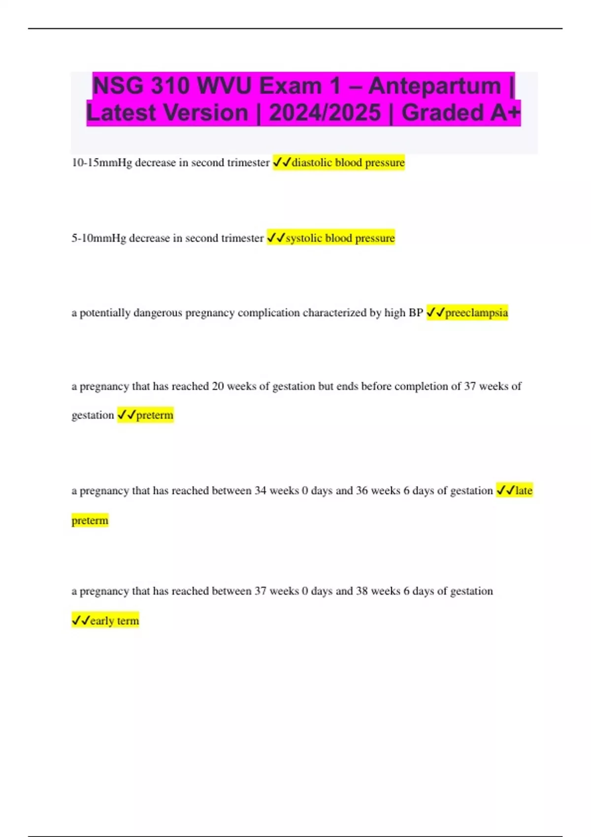 NSG 310 WVU Exam 1 – Antepartum | Latest Version | 2024/2025 | Graded A+ 10-15mmHg decrease in second trimester diastolic blood pressure 5-10mmHg decrease in second trimester systolic blood pressure a potentially dangerous pregnancy complication characterized by high BP preeclampsia a pregnancy that has reached 20 weeks of gestation but ends before completion of 37 weeks of gestation preterm a pregnancy that has reached between 34 weeks 0 days and 36 weeks 6 days of gestation late preterm a pregnancy that has reached between 37 weeks 0 days and 38 weeks 6 days of gestation early term a pregnancy that has reached between 39 weeks 0 days and 40 weeks 6 days of gestation full term a pregnancy that has reached between 41 weeks 0 days and 41 weeks 6 days of gestation late term a pregnancy that has reached between 42 weeks 0 days and beyond of gestation post term A woman who has completed one pregnancy with a fetus or fetuses who have reached 20 weeks of gestation primipara A woman who has completed two or more pregnancies to 20 weeks of gestation or more multipara alkaline phosphatase and serum cholesterol rises in the liver baby drops; ready to go into canal lightening bluish color of perineal area Chadwick's sign cardiac output decreases at _____ weeks due to placenta shutting down 36 cardiac output increases after delivery due to decreased