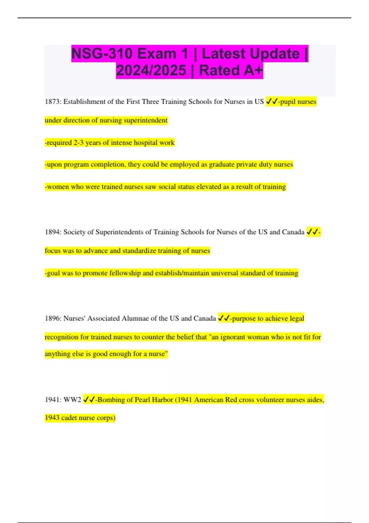 NSG-310 Exam 1 | Latest Update | 2024/2025 | Rated A+ 1873: Establishment of the First Three Training Schools for Nurses in US -pupil nurses under direction of nursing superintendent -required 2-3 years of intense hospital work -upon program completion, they could be employed as graduate private duty nurses -women who were trained nurses saw social status elevated as a result of training 1894: Society of Superintendents of Training Schools for Nurses of the US and Canada - focus was to advance and standardize training of nurses -goal was to promote fellowship and establish/maintain universal standard of training 1896: Nurses' Associated Alumnae of the US and Canada -purpose to achieve legal recognition for trained nurses to counter the belief that "an ignorant woman who is not fit for anything else is good enough for a nurse" 1941: WW2 -Bombing of Pearl Harbor (1941 American Red cross volunteer nurses aides, 1943 cadet nurse corps) -1943: frances payne Bolton, US congress, authorized bill (US public health service established cadet nurse corp whose focus was to increase the number of professional nurses by financially subsidizing nursing education 1950s: Hospitals Became the Major Employers of Nurses -initially nurses were viewed as potential threats to administrations and physicians -experienced professional conflicts -lacked autonomy -nurses identified education as a potential pathway to leadership African-American Nurses -late 1800s: separate hospitals and schools -1908: National Association of Colored Graduate Nurses -1945 discriminatory policies finally changed -cadet nurse corps: army nurse corps and restricted racial quotas, navy nurse corps excluded all African americans, 1944 restriction lifted -1948: ANA biracial integration at district and state levels -1952: all state nurses association had dissolved racial restrictions 1971 National Black Nurses Association American Civil War () -volunteer women demonstrated effectiveness of skilled nursing on improved outcomes -emergence of nurse training schools based on Nightingale apprenticeship model ANA Code of Ethics Provision 1 the nurse practices with compassion and respect for the inherent dignity, worth, and unique attributes of every