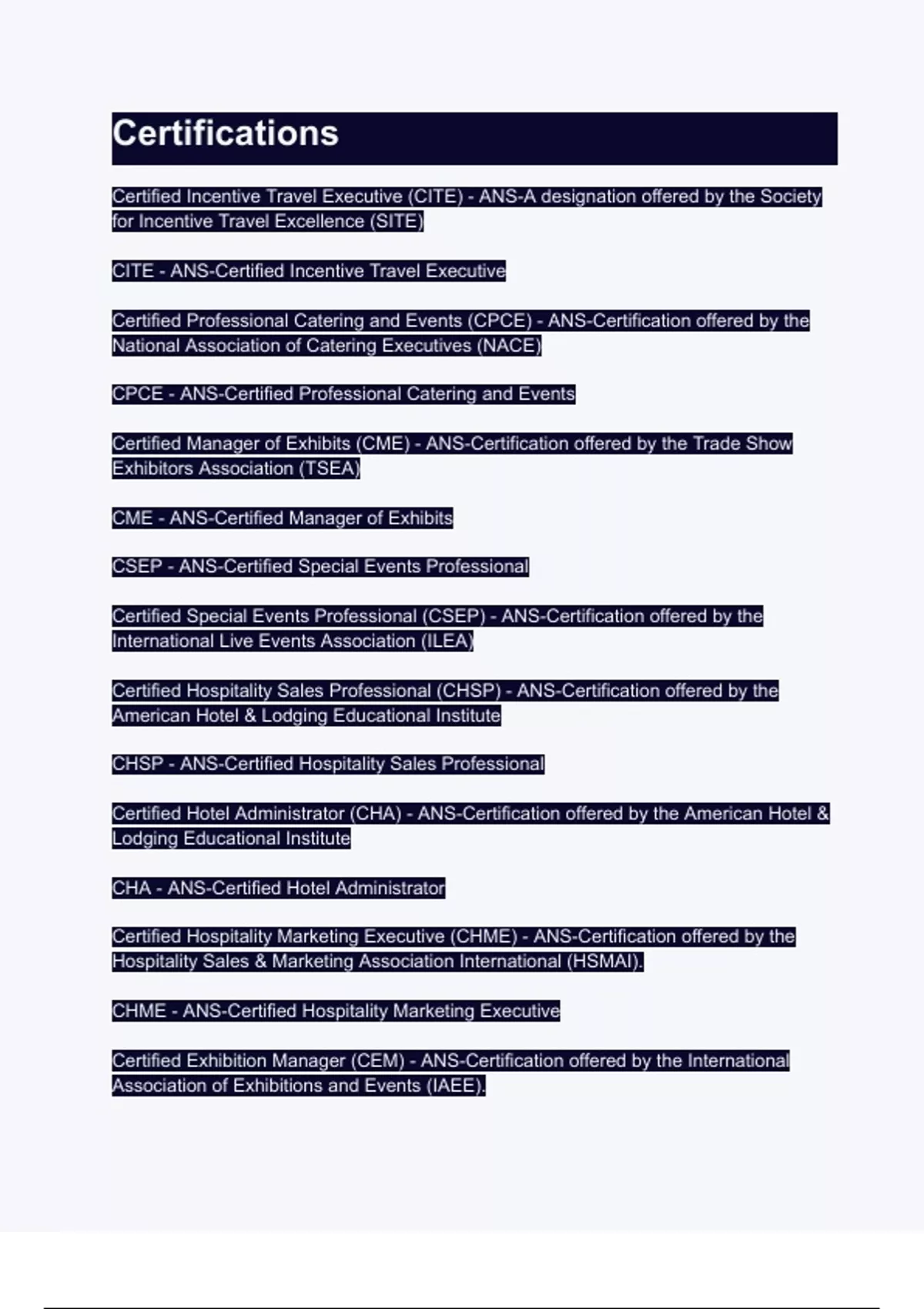 CHME - ANS-Certified Hospitality Marketing Executive