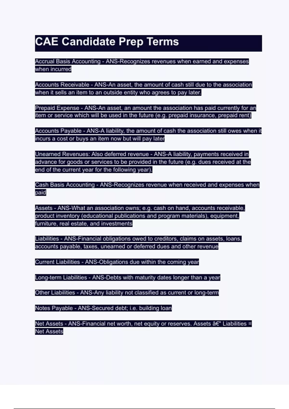 Assets - ANS-What an association owns; e.g. cash on hand, accounts receivable,