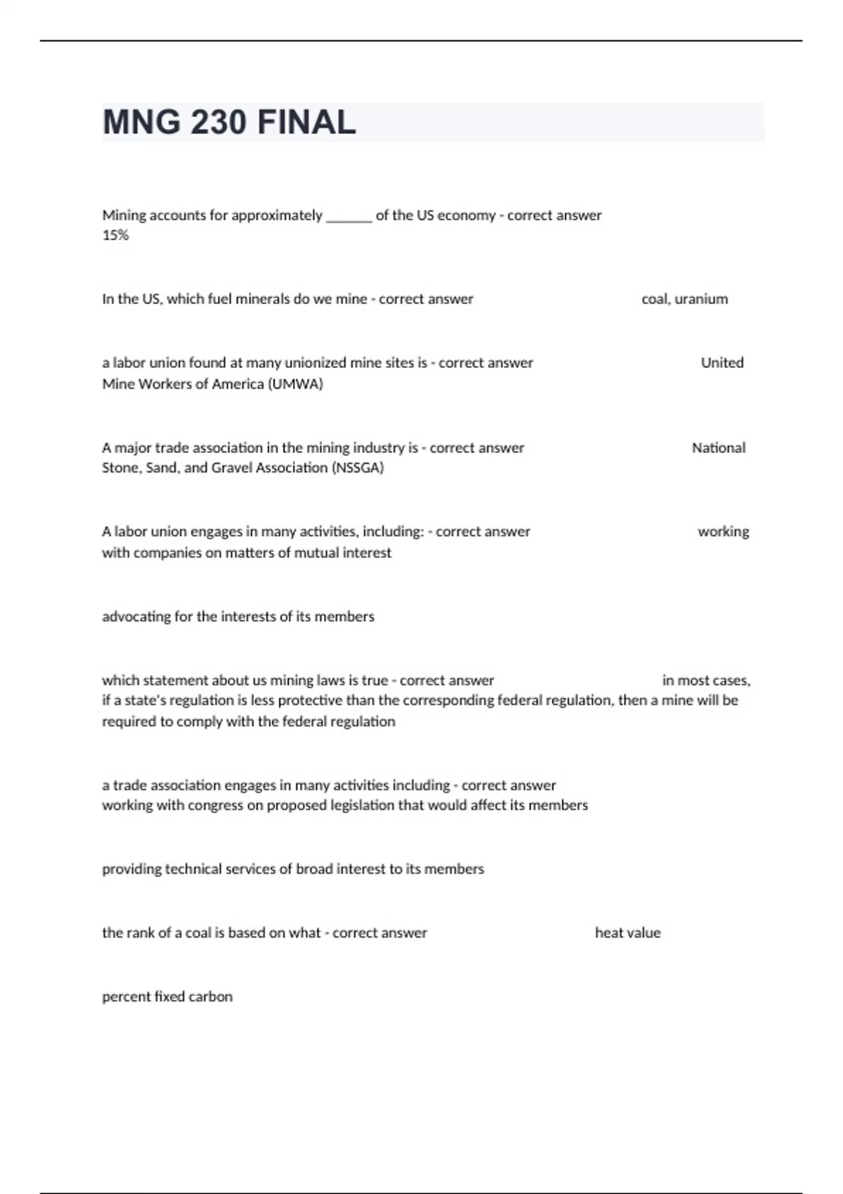 Mining accounts for approximately ______ of the US economy - correct answer 15% In the US, which fuel minerals do we mine - correct answer coal, uranium a labor union found at many unionized mine sites is - correct answer United Mine Workers of America (UMWA) A major trade association in the mining industry is - correct answer National Stone, Sand, and Gravel Association (NSSGA) A labor union engages in many activities, including: - correct answer working with companies on matters of mutual interest advocating for the interests of its members which statement about us mining laws is true - correct answer in most cases, if a state's regulation is less protective than the corresponding federal regulation, then a mine will be required to comply with the federal regulation a trade association engages in many activities including - correct answer working with congress on proposed legislation that would affect its members providing technical services of broad interest to its members the rank of a coal is based on what - correct answer heat value percent fixed carbon what is the fundamental difference between a maceral and a mineral - correct answer one is organic and the other is inorganic currently there are fewer than ten uranium-mining operations in the US - correct answer true what is the goal if mineral processing - correct answer to concentrate the minerals of interest to beneficiate the valuable components of the ore to liberate the minerals of interest choose the industrial minerals from this list - correct answer salt talc phosphate trona acme mining company has just moved into your small, scenic community. which of the following ideas might the company employ to build a positive relationship with the people and community in which they are located - correct answer hold an acme mine community day with a cookout, mine tours, and an explanation of sound mining practices which of these key federal agencies routinely has at least one inspector at each mining operation multiple times per year and in large mines this agency often has at least one inspector on site nearly every single day - correct answer MSHA match the coal rank to its descriptors - correct answer anthracite- this is the highest rank of coal bituminous- rank of coal characterized by a heating value and is the most common type of coal used in electricity generation in US subbituminous- not the greatest in the heating value department, but not the worst of the four lignite- lowest grade of coal with least amount of carbon match the rank of coal to its descriptors - correct answer anthracite- hard, brittle, black, shiny called hard coal bituminous- looks shiny and smooth but close look shows many layers subbituminous- looks dull lignite- known as brown coal choose the answer that shows the 5 stages of mining in the correct order - correct answer prospecting, exploration, development, exploitation, reclamation match the activities to the correct stages of mining - correct answer beneficiation activities- exploitation leaving area free of safety and environmental hazards- reclamation preparing for extraction of the ore/material- development finding geologic anomalies- prospecting a problem in risk management- exploration match the activities to the correct stages of mining - correct answer returning to the mine site to its original condition- reclamation using mining equipment to extract the ore- exploitation using accumulated knowledge to narrow the search- prospecting estimating the quantity of the orebody- exploration conducting a feasibility study- development as related to mining, important acts within the category of environmental protection laws are - correct answer the clean water act the endangered species act mining companies are not legally bound to comply with administrative regulations and will not face civil or criminal action for noncompliance - correct answer false choose the correct statement - correct answer title 30 contains regulations related to the mineral resources if you've acquired the rights to mine on private land, what mineral rights are automatically transferred tp you - correct answer only agreed upon minerals the owner of a patented claim can use the land for - correct answer any legal purpose choose true statements about unpatented claims - correct answer gives the right to explore and mine only valid during active work land can be reverted back to the public domain which federal us agency is responsible for administering the general mining law of 1872 - correct answer the bureau of land management what must you do if you find historically or culturally significant items of structures on the land on which you have the right to mine - correct answer protect findings laws are passed by the government, may have provisions with which mining companies must comply, and often direct administrative agencies to develop specific regulations to govern how the laws will be enforced - correct answer true rights to prospect, explore, and mine for minerals that are not classified as locatable on public lands are conveyed by - correct answer leasing the land from the bureau of land management which of the following is false - correct answer an act is a bill that's been passed by the legislature but has not yet been signed into law the amendment to the general mining law of 1872 known as the mineral leasing act of 1920 made a very important change to the 1872 law - correct answer it removed several minerals from the list of those that could be classified as locatable under the original law the general mining law of 1872 is still controversial today because it allows for the depletion of the supply of valuable minerals - correct answer false the general mining law of 1872 defined locatable minerals as the types of minerals that could be claimed under the law - correct answer cinnabar copper silver gold which of the following is true - correct answer a lode is a hard rock vein choose the industrial minerals from the l