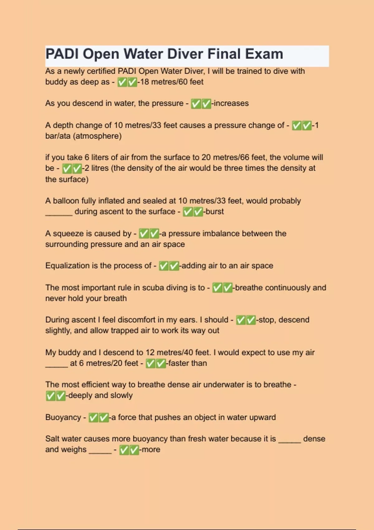 PADI Open Water Diver Final Exam test Questions with explanations of answers | latest update 2024
