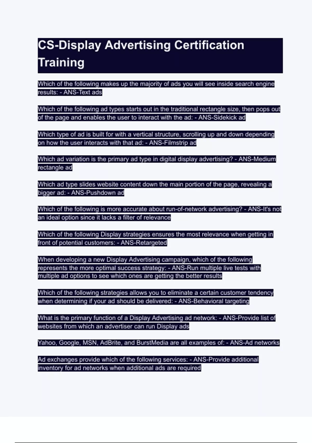 CS-Display Advertising Certification Training Questions with 100% Actual correct answers | verified | latest update | Graded A+ | Already Passed | Complete Solution