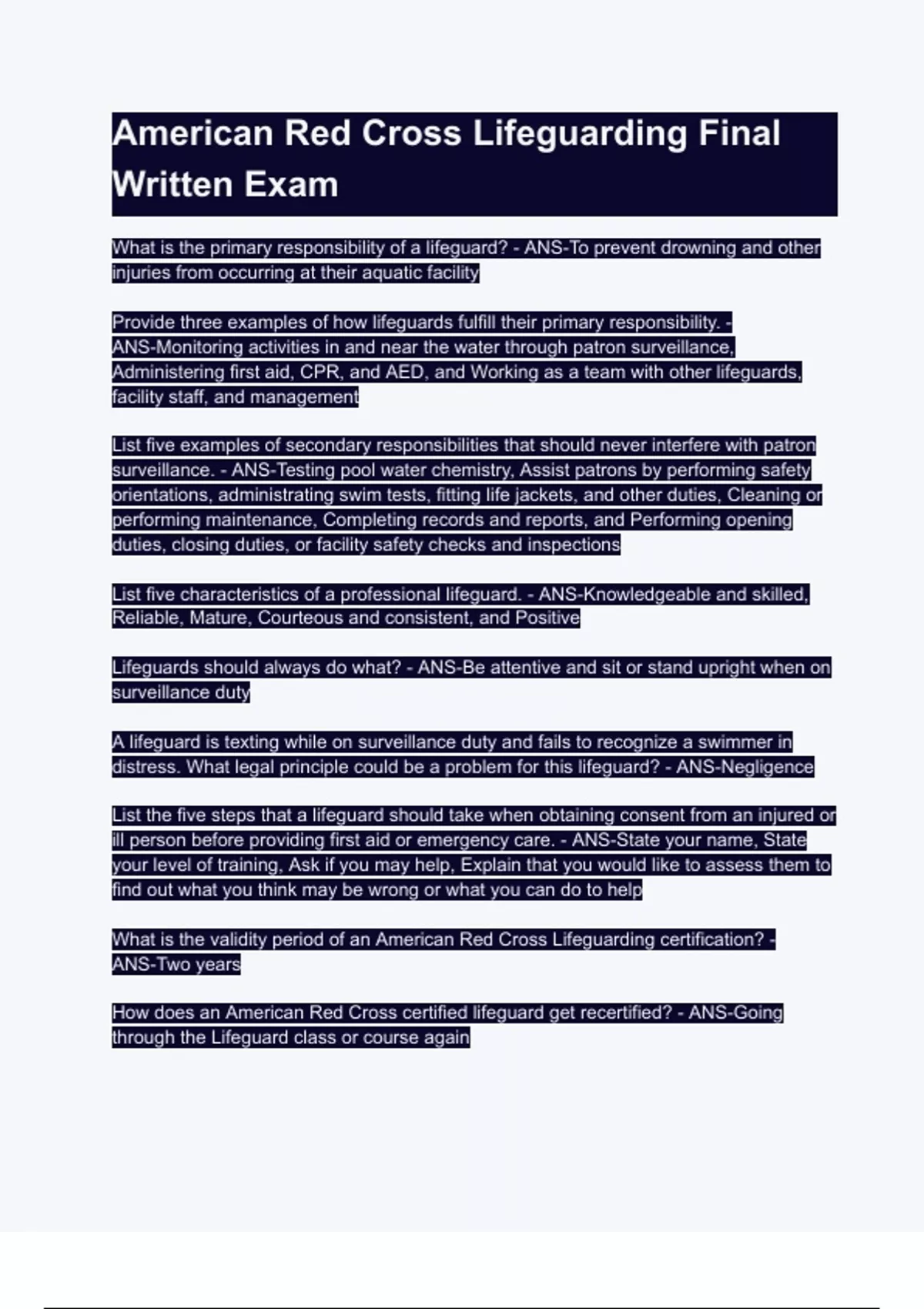 What is the primary responsibility of a lifeguard? - ANS-To prevent drowning and other