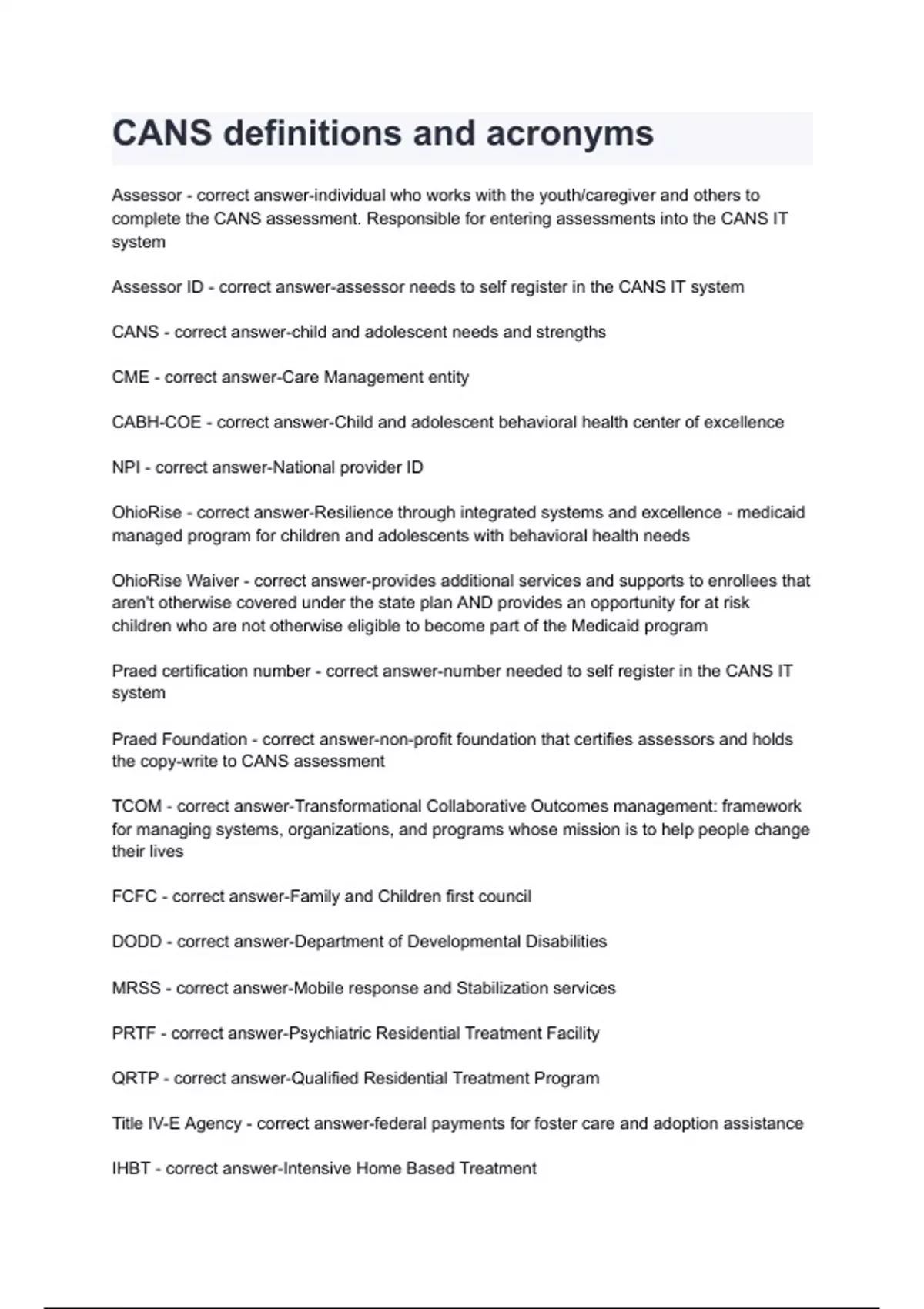 CANS - correct answer-child and adolescent needs and strengths
