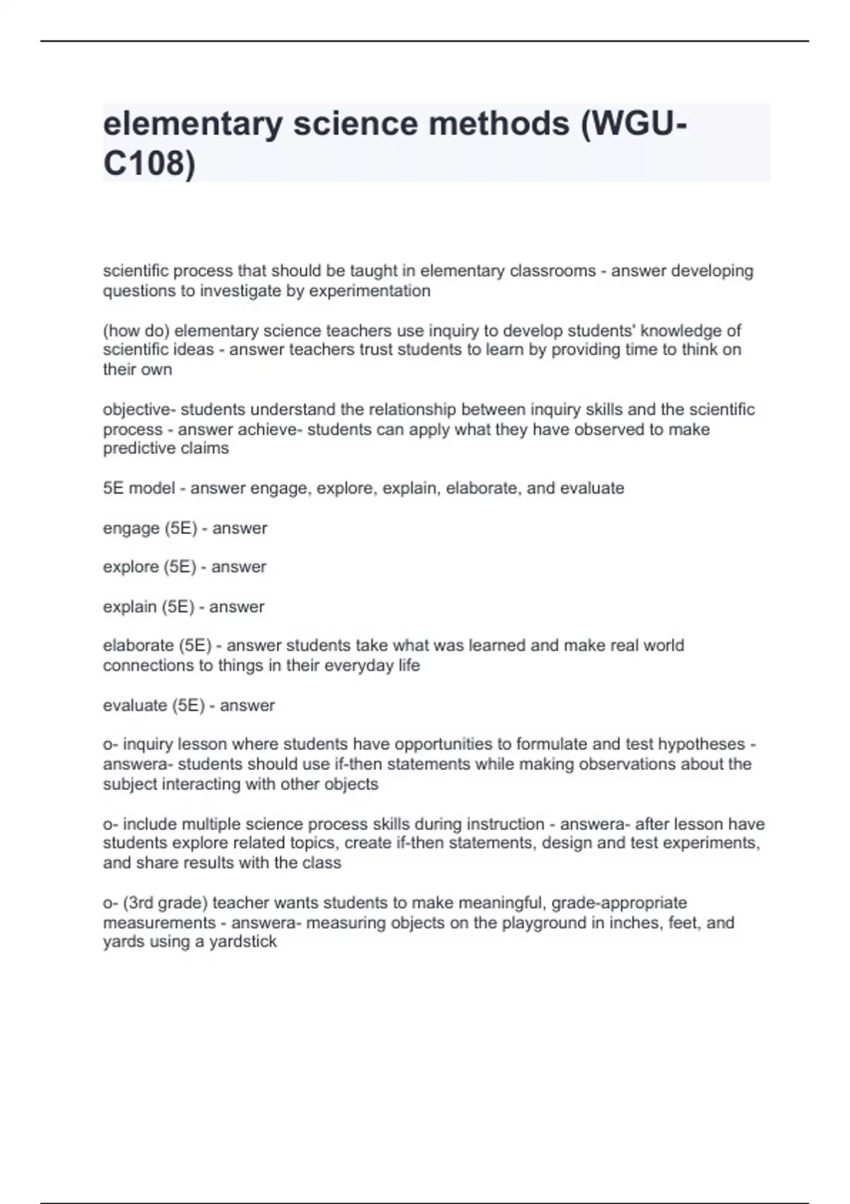 elementary science methods (WGU- C108) Questions and Answers 100% Correct