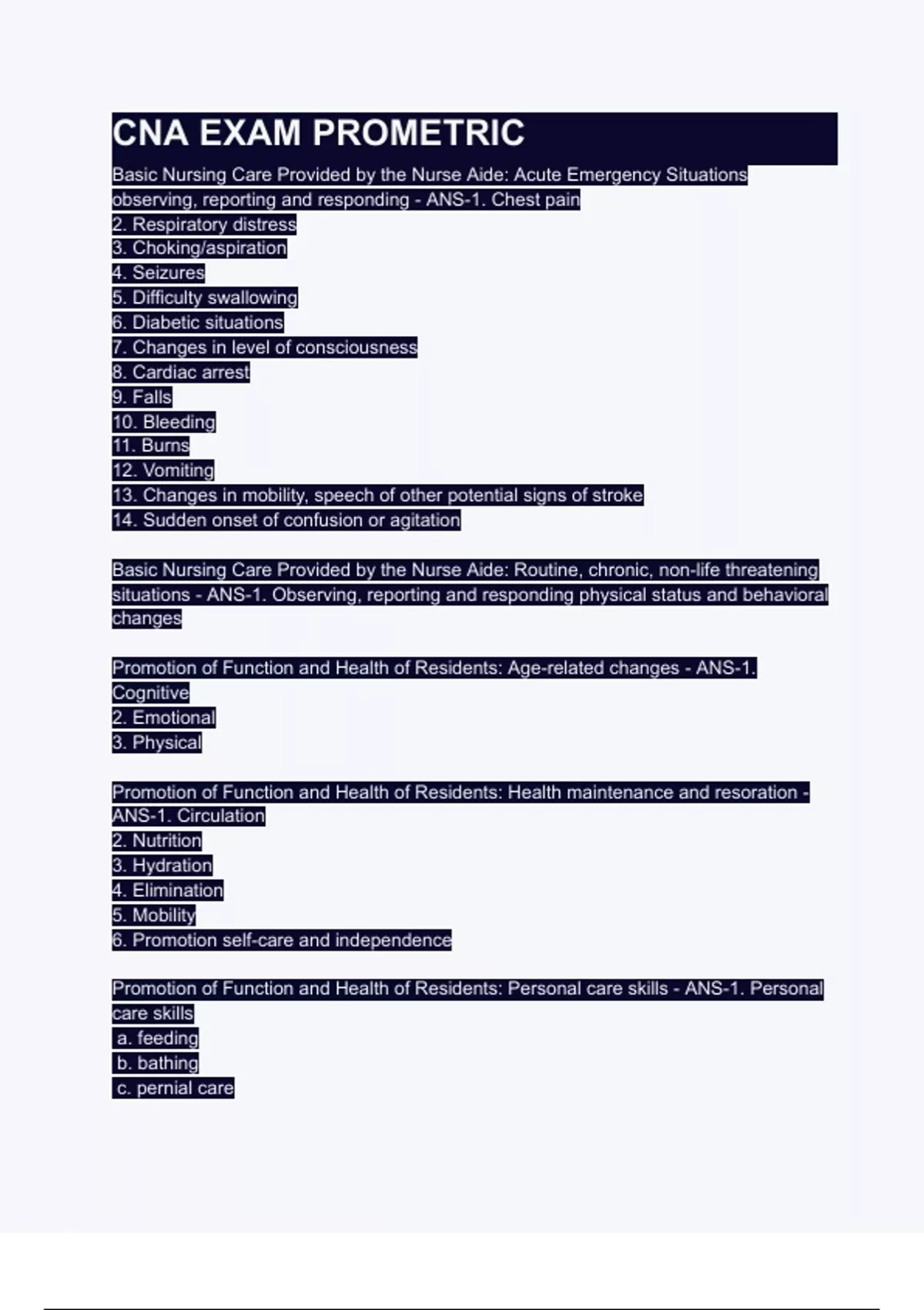 Promotion of Function and Health of Residents: Personal care skills - ANS-1. Personal