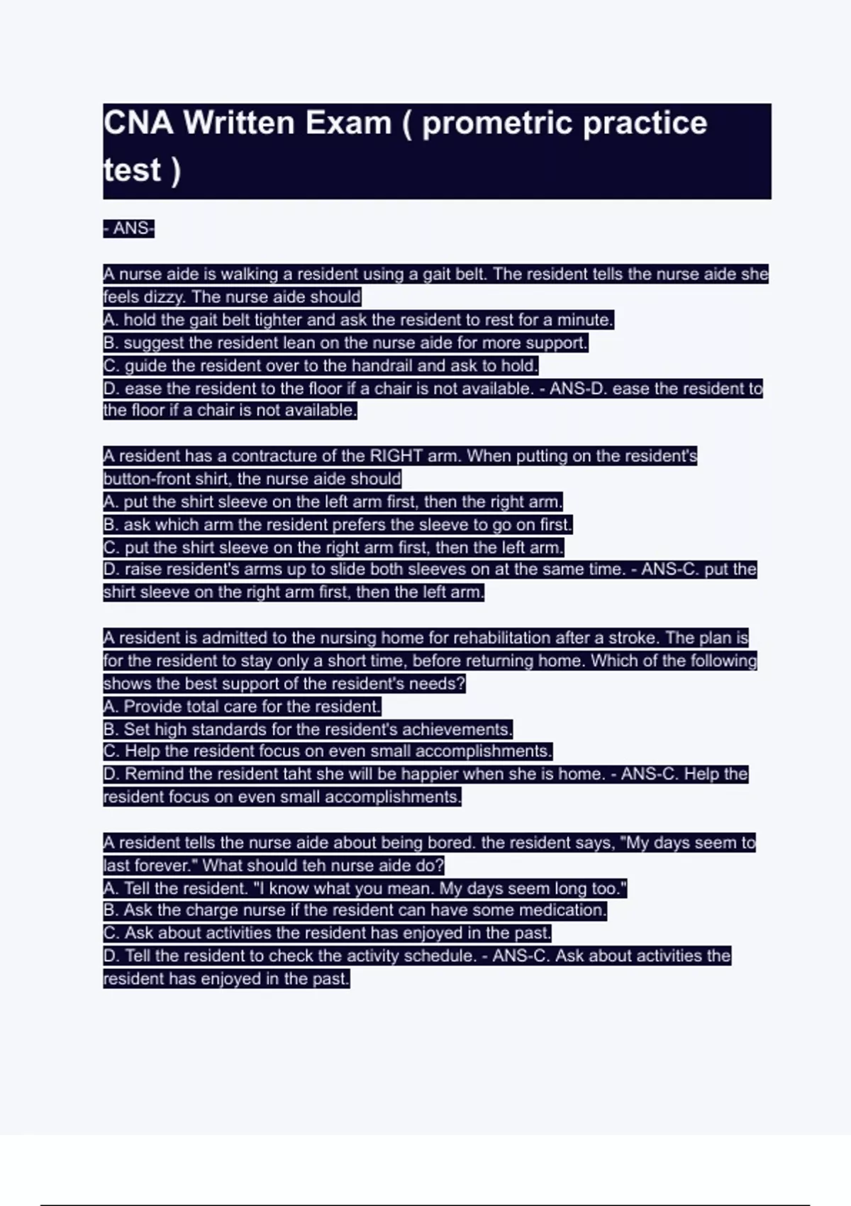 CNA Written Exam ( prometric practice test )