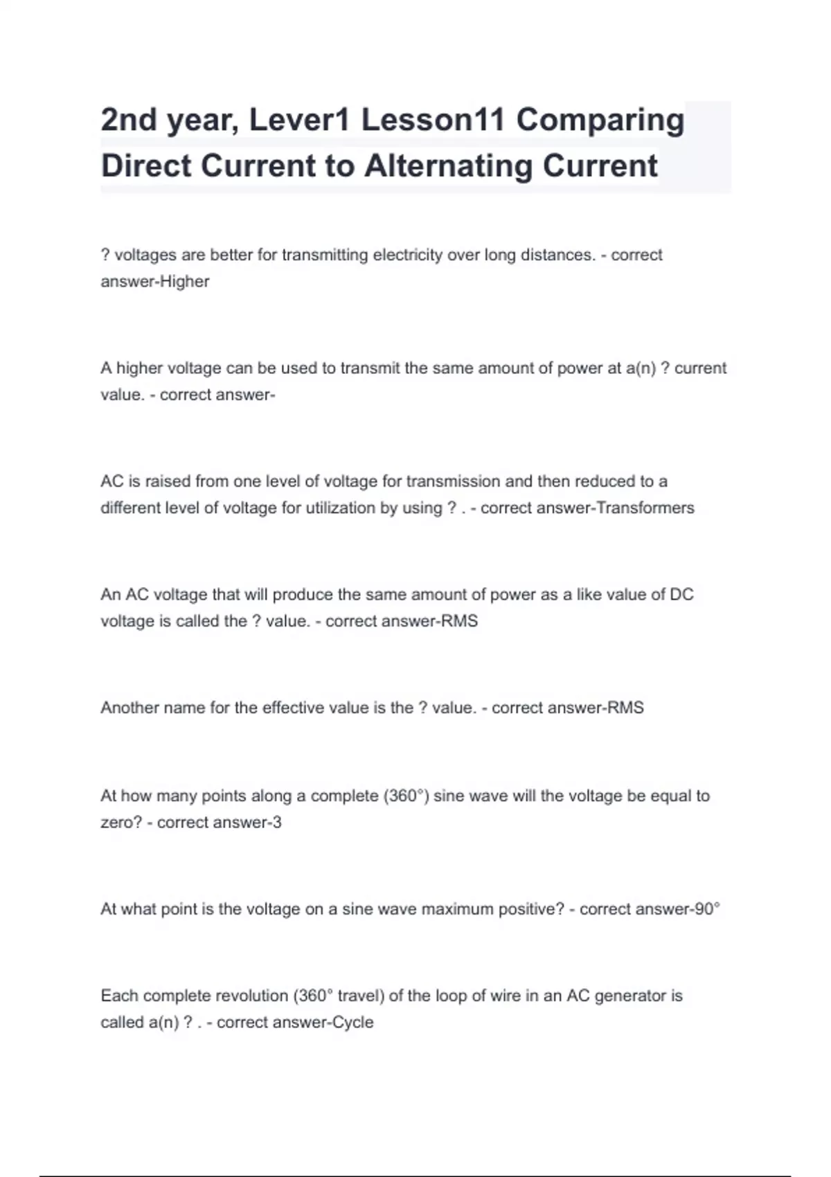 2nd year, Lever1 Lesson11 Comparing Direct Current to Alternating Current Questions with 100% Actual correct answers | verified | latest update | Graded A+ | Already Passed | Complete Solution