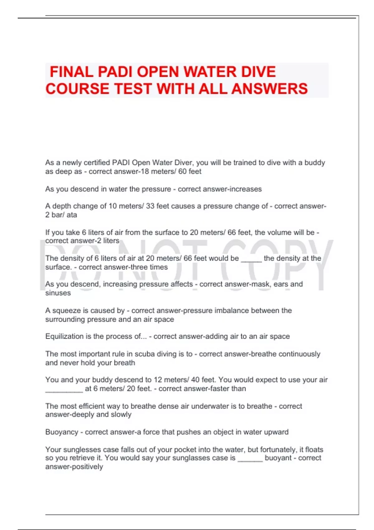 FINAL PADI OPEN WATER DIVE COURSE TEST WITH ALL ANSWERS