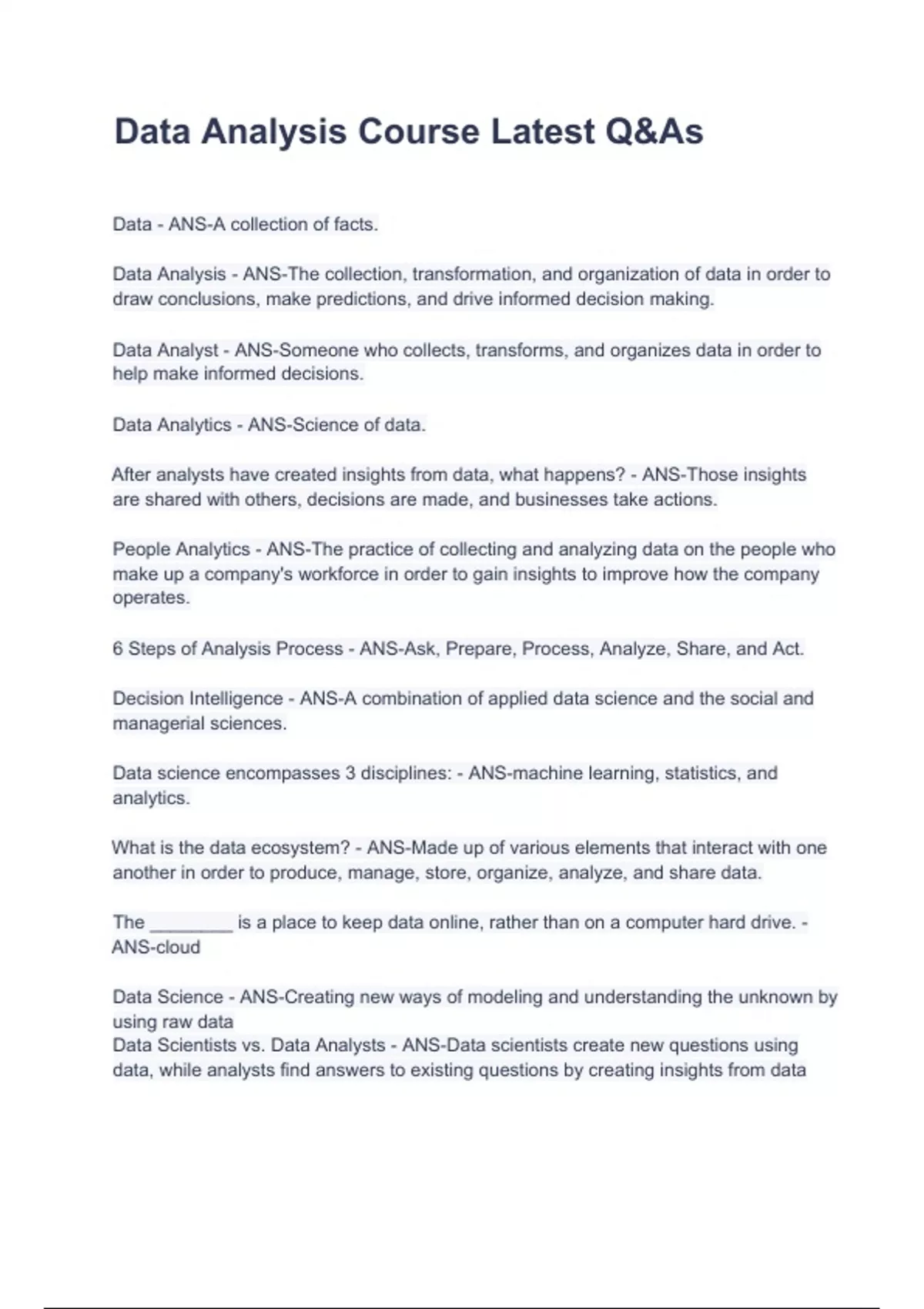 Data Analysis Course Latest Q&As