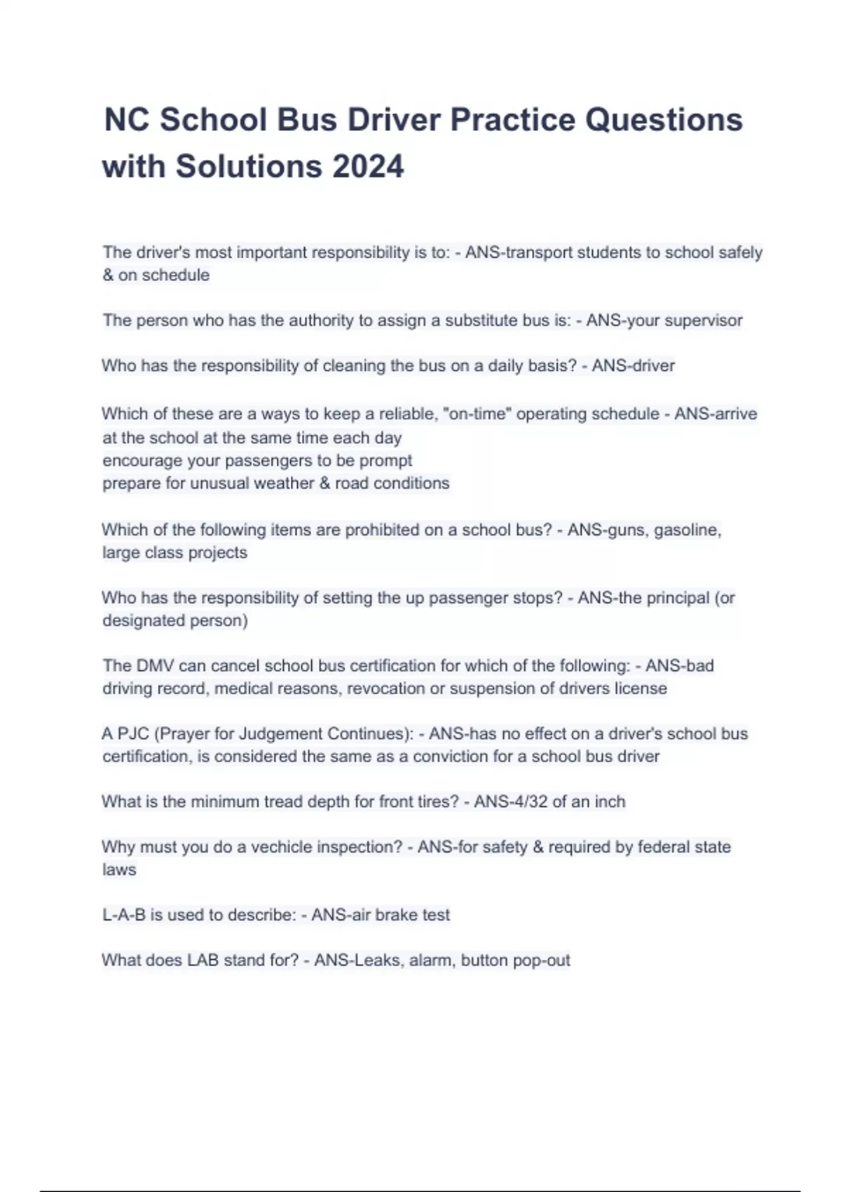 NC School Bus Driver Practice Questions with Solutions 2024.