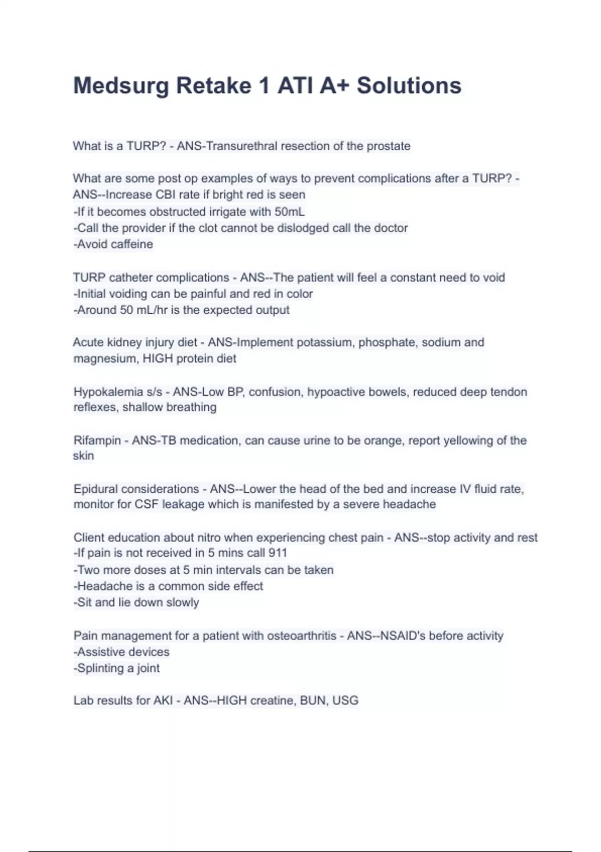 Medsurg Retake 1 ATI A+ Solutions