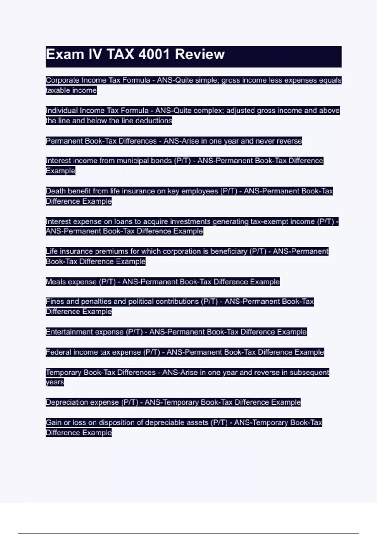 Exam IV TAX 4001 Review