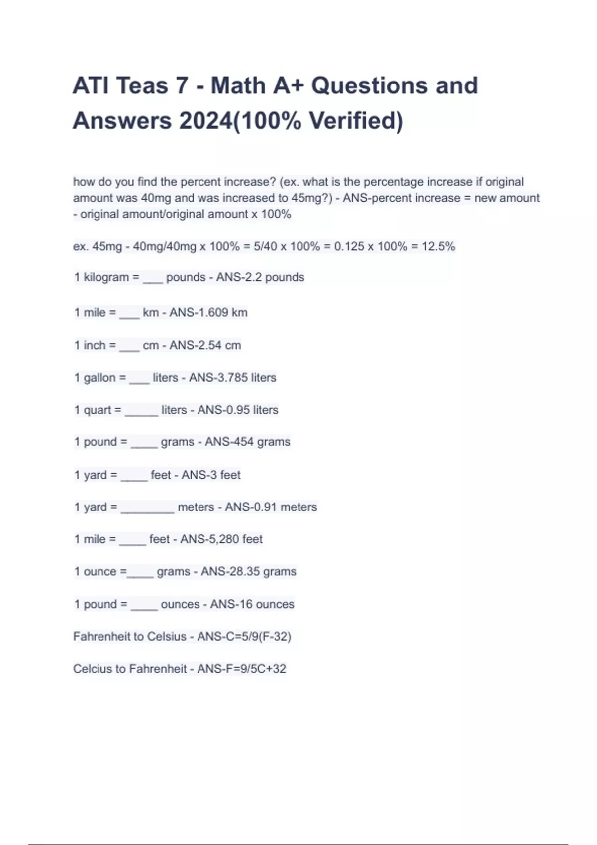 ATI Teas 7 - Math A+ Questions and