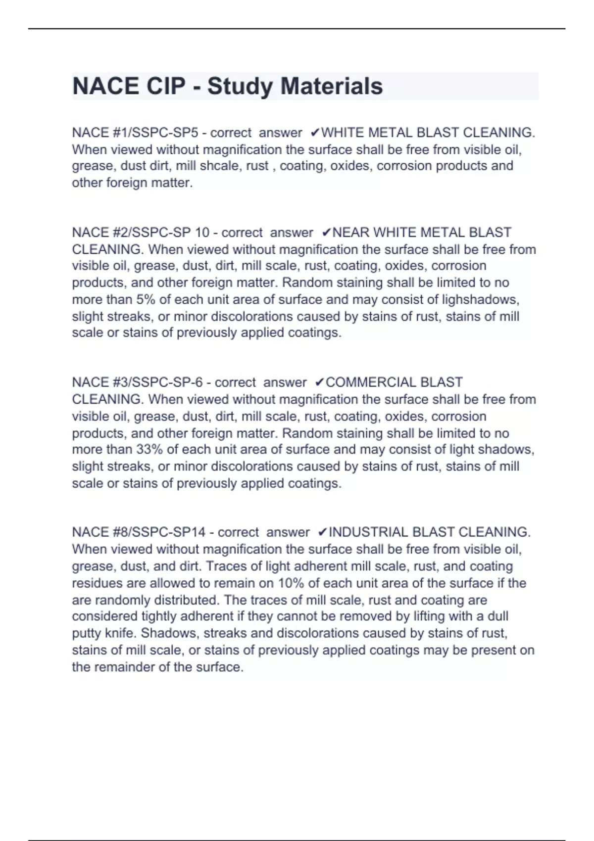 NACE CIP Question and answers rated A+NACE CIP - Study Materials NACE #1/SSPC-SP5 - correct answer WHITE METAL BLAST CLEANING. When viewed without magnification the surface shall be free from visible oil, grease, dust dirt, mill shcale, rust , coating, oxides, corrosion products and other foreign matter. NACE #2/SSPC-SP 10 - correct answer NEAR WHITE METAL BLAST CLEANING. When viewed without magnification the surface shall be free from visible oil, grease, dust, dirt, mill scale, rust, coating, oxides, corrosion products, and other foreign matter. Random staining shall be limited to no more than 5% of each unit area of surface and may consist of lighshadows, slight streaks, or minor discolorations caused by stains of rust, stains of mill scale or stains of previously applied coatings. NACE #3/SSPC-SP-6 - correct answer COMMERCIAL BLAST CLEANING. When viewed without magnification the surface shall be free from visible oil, grease, dust, dirt, mill scale, rust, coating, oxides, corrosion products, and other foreign matter. Random staining shall be limited to no more than 33% of each unit area of surface and may consist of light shadows, slight streaks, or minor discolorations caused by stains of rust, stains of mill scale or stains of previously applied coatings. NACE #8/SSPC-SP14 - correct answer INDUSTRIAL BLAST CLEANING. When viewed without magnification the surface shall be free from visible oil, grease, dust, and dirt. Traces of light adherent mill scale, rust, and coating residues are allowed to remain on 10% of each unit area of the surface if the are randomly distributed. The traces of mill scale, rust and coating are considered tightly adherent if they cannot be removed by lifting with a dull putty knife. Shadows, streaks and discolorations caused by stains of rust, stains of mill scale, or stains of previously applied coatings may be present on the remainder of the surface.