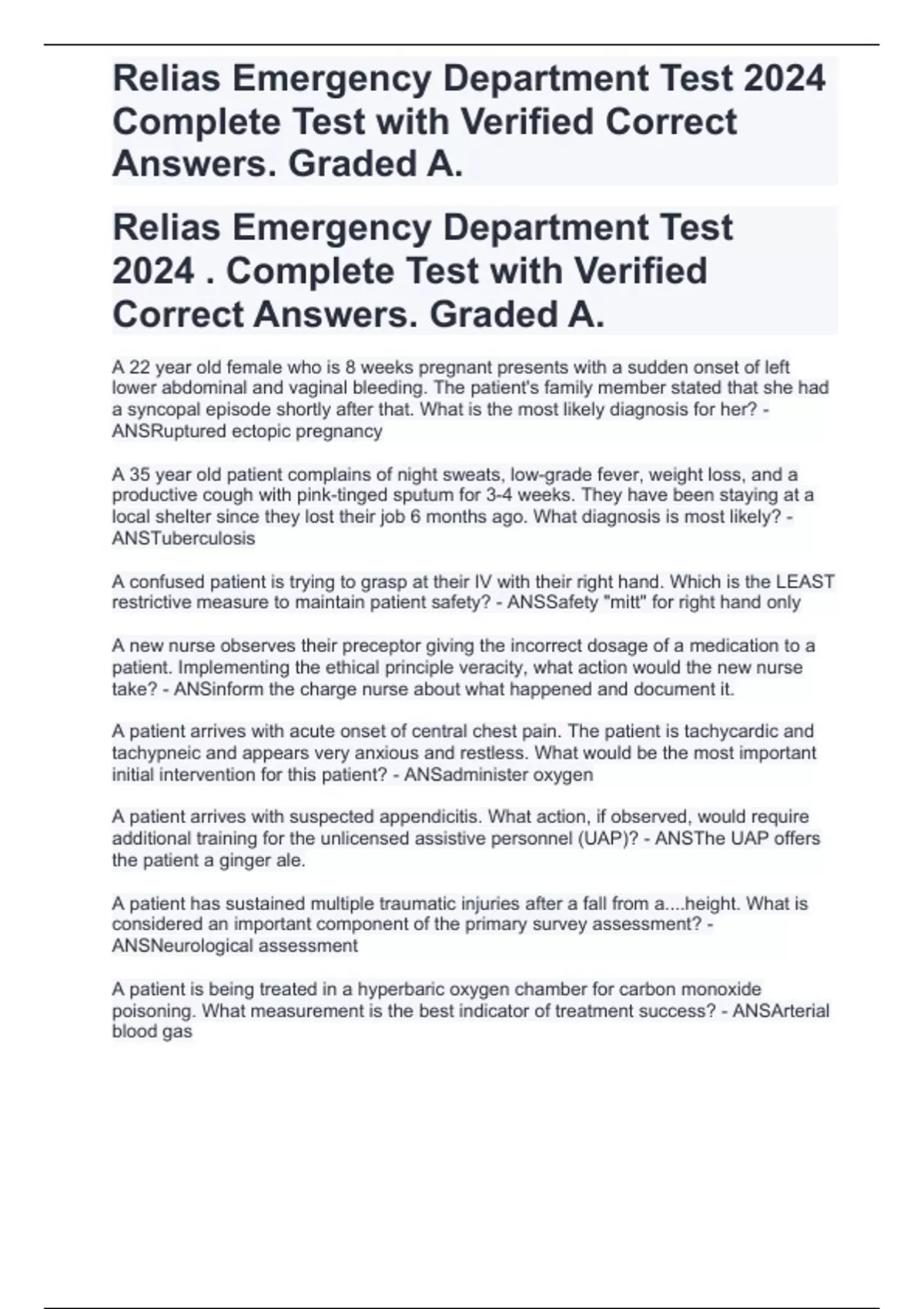 Relias Emergency Department Test 2024 . Complete Test with Verified Correct Answers. Graded A.
