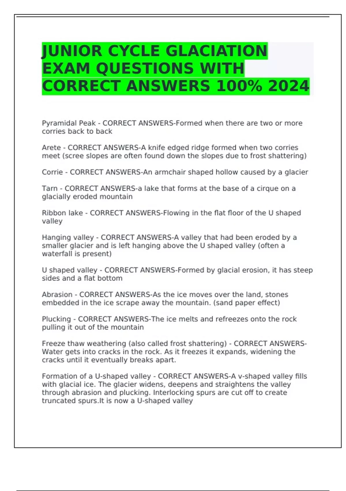 JUNIOR CYCLE GLACIATION EXAM QUESTIONS WITH CORRECT ANSWERS 100% 2024