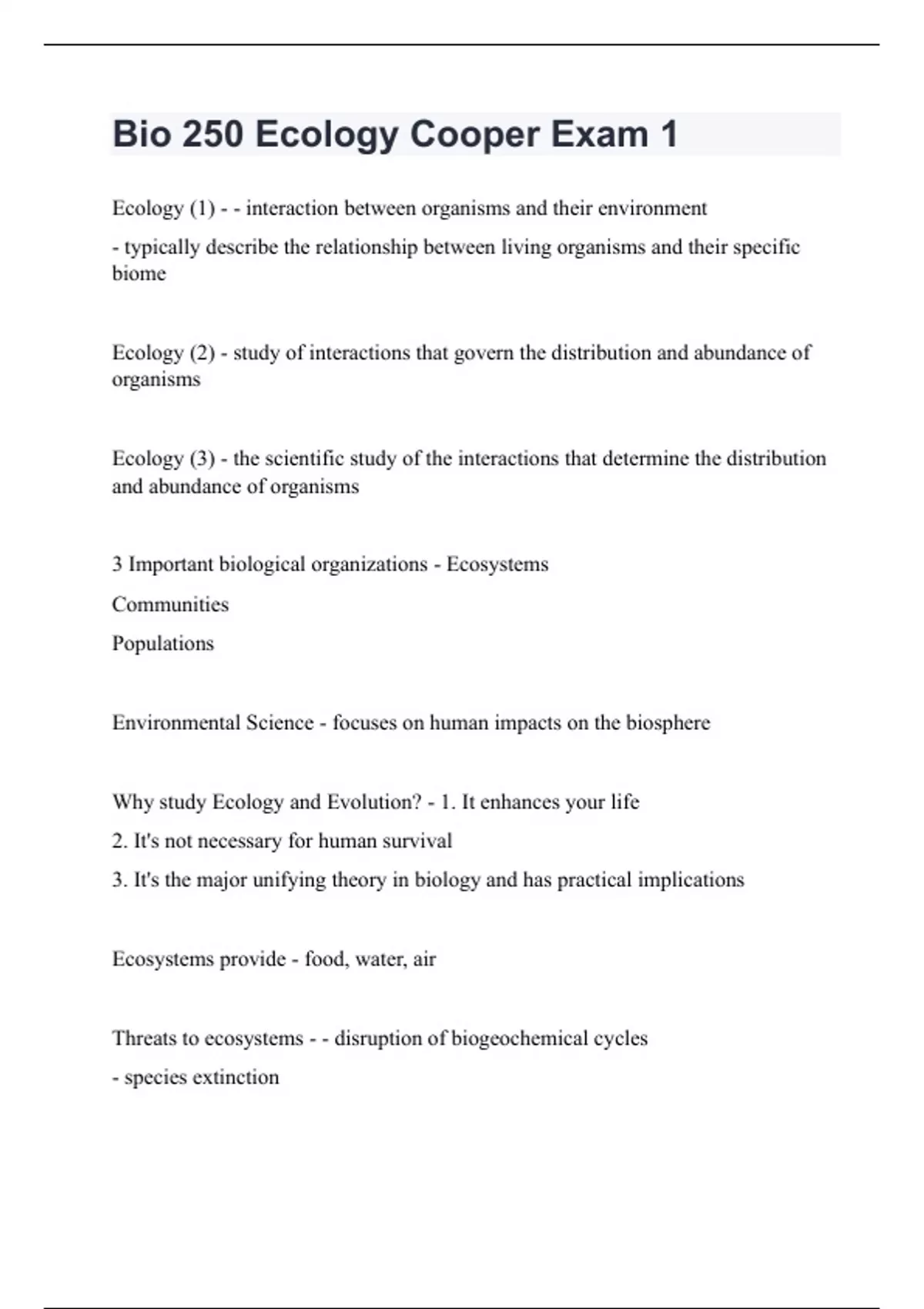 Ecology (1) - - interaction between organisms and their environment - typically describe the relationship between living organisms and their specific biome Ecology (2) - study of interactions that govern the distribution and abundance of organisms Ecology (3) - the scientific study of the interactions that determine the distribution and abundance of organisms 3 Important biological organizations - Ecosystems Communities Populations Environmental Science - focuses on human impacts on the biosphere Why study Ecology and Evolution? - 1. It enhances your life 2. It's not necessary for human survival 3. It's the major unifying theory in biology and has practical implications Ecosystems provide - food, water, air Threats to ecosystems - - disruption of biogeochemical cycles - species extinction - global warming, climate change - depletion of ozone layer - toxins practical implications of ecology and evolution - - conservation genetics - selective breeding and genetic modifications - rapid evolution of traits, such as antibiotic resistance Subdivisions of ecology - - Applied Ecology - Environmental Science applied ecology - application of ecology to management questions environmental science - - focuses on human impact made on the environment - describes the environment, interprets the impact of human actions on terrestrial and aquatic ecosystems, and develops strategies for restoring ecosystems Ways humans impact cycles - - exotics - over harvesting - habitat loss - climate change antibiotic resistance - widespread resistance to pesticides among insects; the evolution of drug resistance in the agents of disease, from malaria to tuberculosis; the possibility that, say, the virus that causes bird flu will evolve into a form that spreads easily from person to person