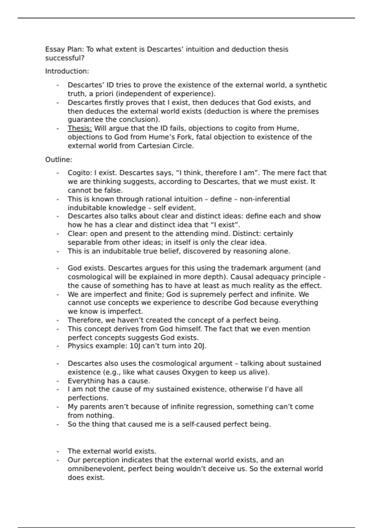 Essay Plan: To what extent is Descartes’ intuition and deduction thesis