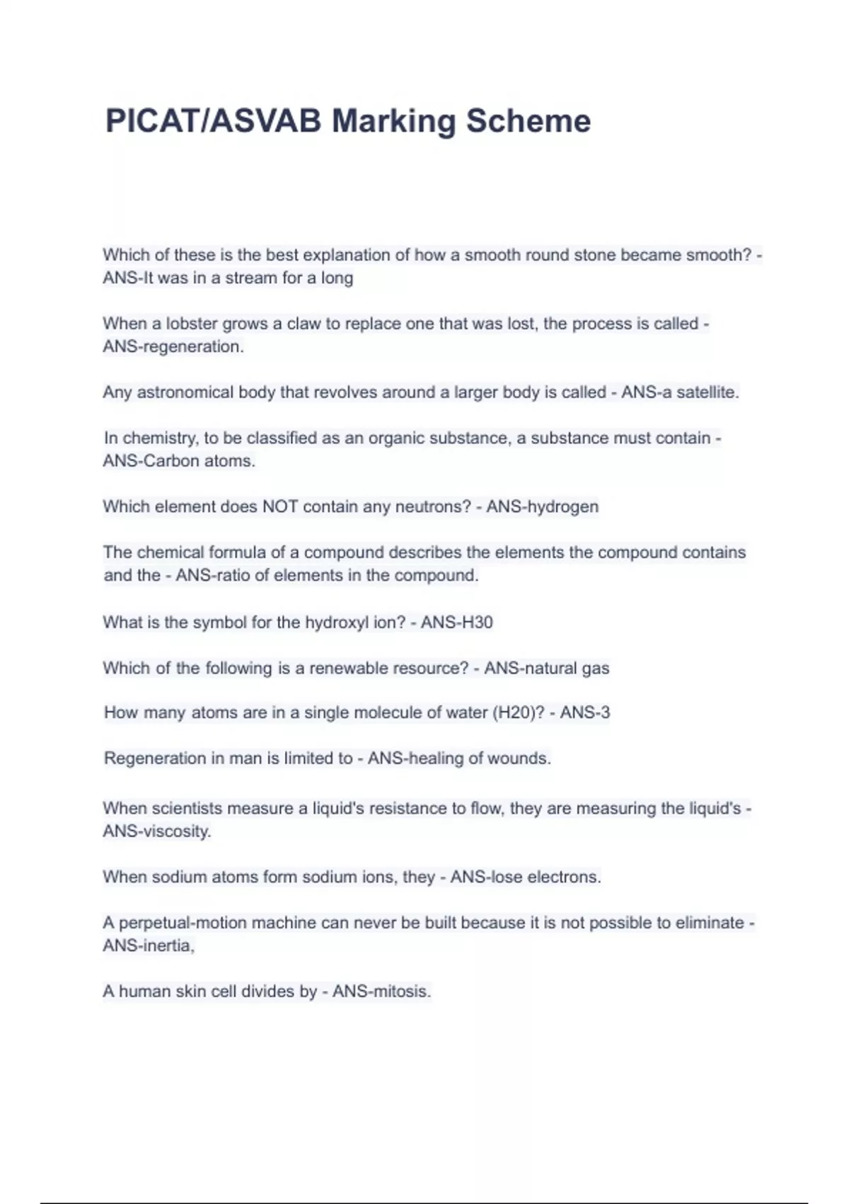 PICAT/ASVAB Marking Scheme