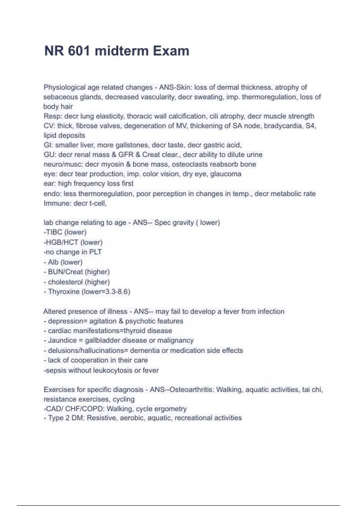 Resp: decr lung elasticity, thoracic wall calcification, cili atrophy, decr muscle strength