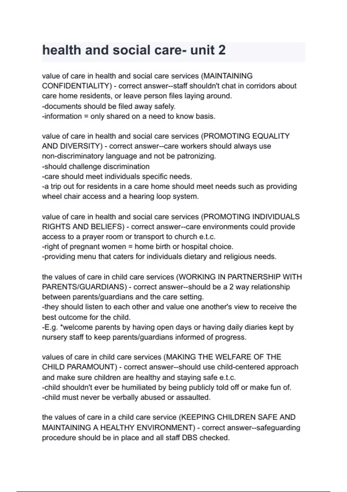 health and social care- unit 2 Questions with 100% Actual correct answers | verified | latest update | Graded A+ | Already Passed | Complete Solution