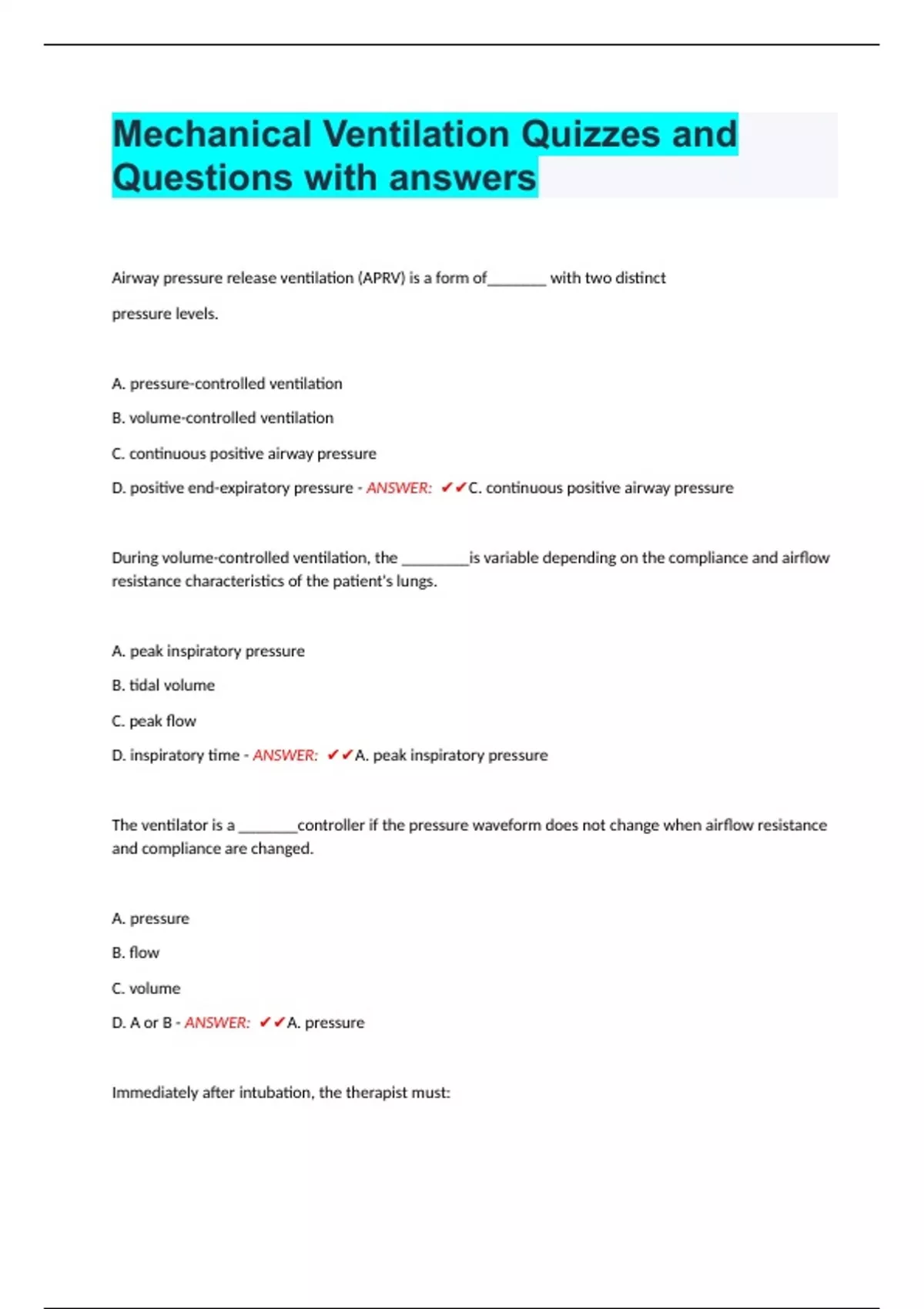 D. positive end-expiratory pressure - ANSWER: ✔✔C. continuous positive airway pressure