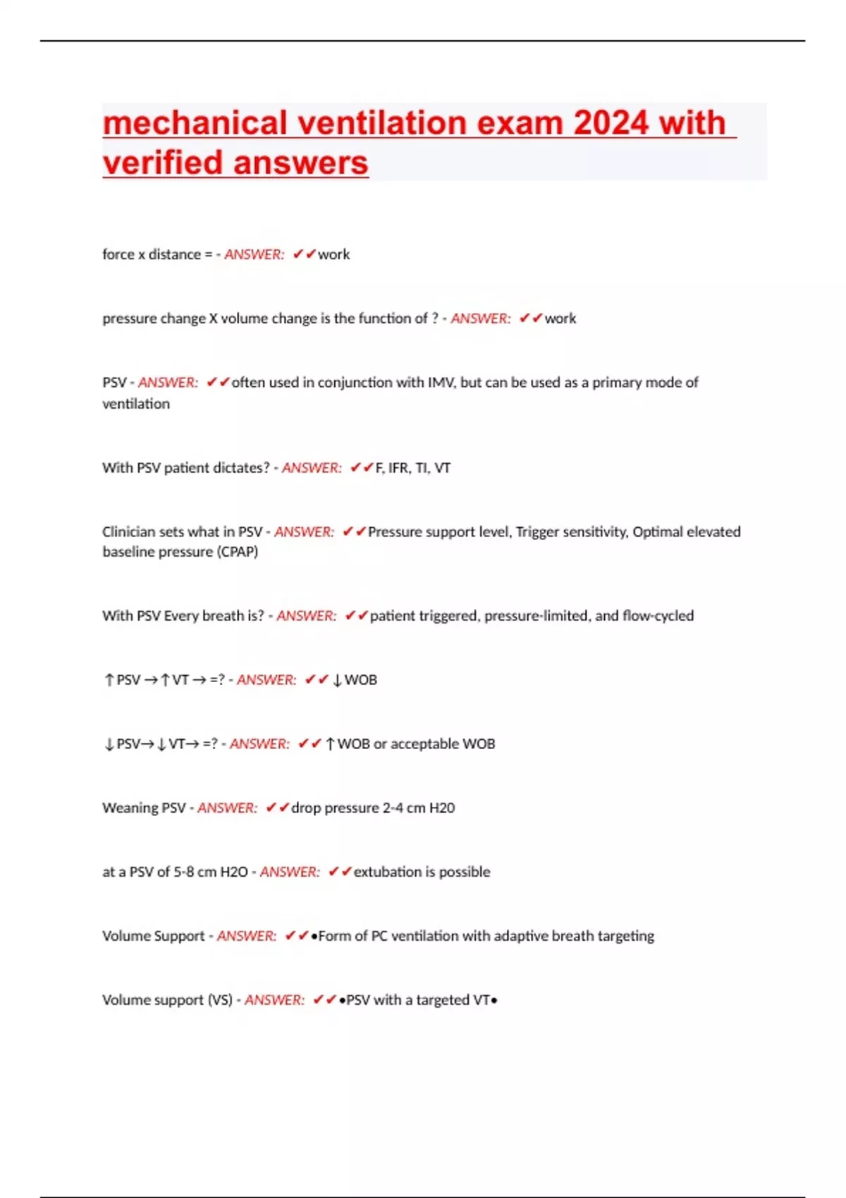 force x distance = - ANSWER: work pressure change X volume change is the function of ? - ANSWER: work PSV - ANSWER: often used in conjunction with IMV, but can be used as a primary mode of ventilation With PSV patient dictates? - ANSWER: F, IFR, TI, VT Clinician sets what in PSV - ANSWER: Pressure support level, Trigger sensitivity, Optimal elevated baseline pressure (CPAP)