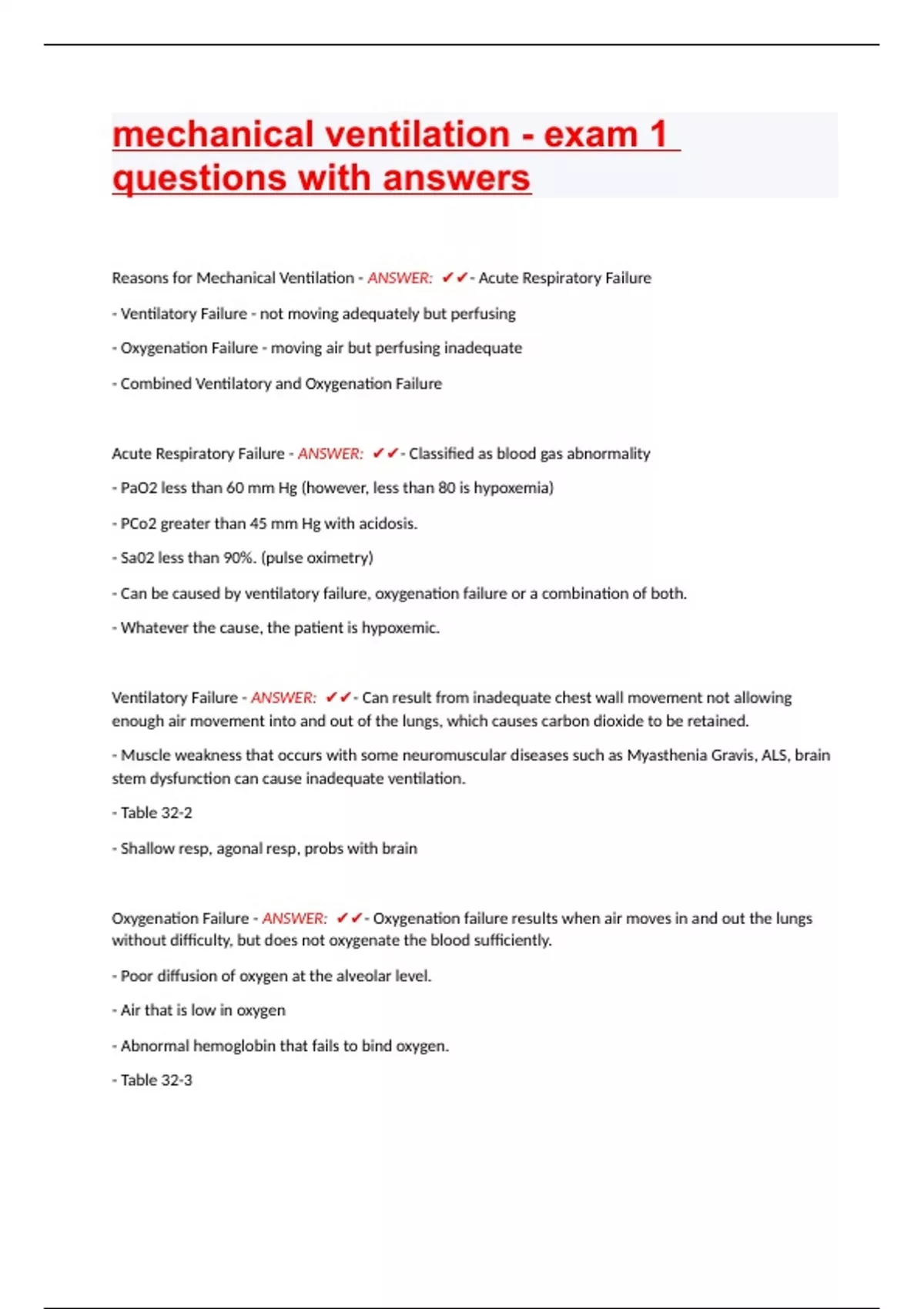 Reasons for Mechanical Ventilation - ANSWER: - Acute Respiratory Failure - Ventilatory Failure - not moving adequately but perfusing - Oxygenation Failure - moving air but perfusing inadequate - Combined Ventilatory and Oxygenation Failure Acute Respiratory Failure - ANSWER: - Classified as blood gas abnormality - PaO2 less than 60 mm Hg (however, less than 80 is hypoxemia) - PCo2 greater than 45 mm Hg with acidosis. - Sa02 less than 90%. (pulse oximetry) - Can be caused by ventilatory failure, oxygenation failure or a combination of both. - Whatever the cause, the patient is hypoxemic.