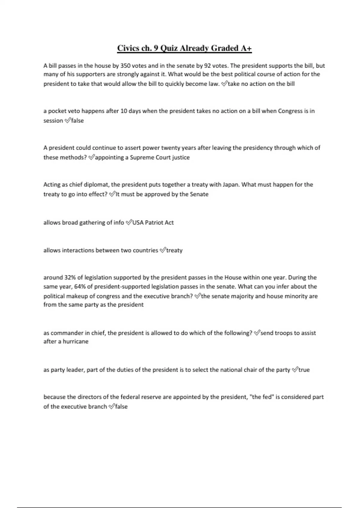 Civics ch. 9 Quiz Already Graded A+ A bill passes in the house by 350 votes and in the senate by 92 votes. The president supports the bill, but many of his supporters are strongly against it. What would be the best political course of action for the president to take that would allow the bill to quickly become law. take no action on the bill a pocket veto happens after 10 days when the president takes no action on a bill when Congress is in session false A president could continue to assert power twenty years after leaving the presidency through which of these methods? appointing a Supreme Court justice Acting as chief diplomat, the president puts together a treaty with Japan. What must happen for the treaty to go into effect? It must be approved by the Senate allows broad gathering of info USA Patriot Act allows interactions between two countries treaty around 32% of legislation supported by the president passes in the House within one year. During the same year, 64% of president-supported legislation passes in the senate. What can you infer about the political makeup of congress and the executive branch? the senate majority and house minority are from the same party as the president as commander in chief, the president is allowed to do which of the following? send troops to assist after a hurricane as party leader, part of the duties of the president is to select the national chair of the party true because the directors of the federal reserve are appointed by the president, "the fed" is considered part of the executive branch false check on presidential power to wage war War Powers Act Directs action without congressional approval executive order During which circumstance is the inherent powers of the president most likely to expand? struggling economy Executive privilege allows the president to speak freely with advisers about strategy without fear that Congress will question what was said in private to arrive at that strategy true how did FDR avoid the usual checks and balances necessary when working with foreign gov? he negotiated an executive agreement to aid Great Britain in fighting Nazi Germany ideas proposed by the president are more likely to be incorporated into legislation if the president is popular with the public true in congress is controlled by the party other than the president's, his or her budget is likely to be changed dramatically performs ceremonial duties overseas head of state power to negotiate with other countries chief diplomat power to use the military for defense commander in chief Presidential impoundment of funds that were appropriated for new military air