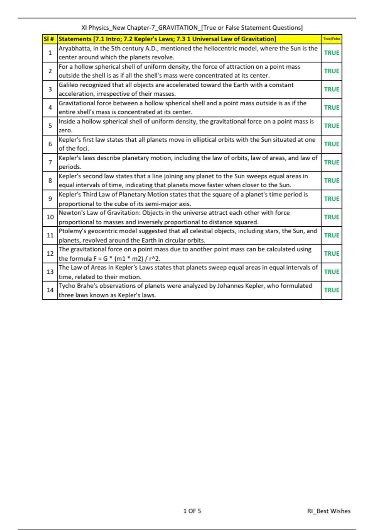 Sl # Statements [7.1 Intro; 7.2 Kepler's Laws; 7.3 1 Universal Law of Gravitation] True/False