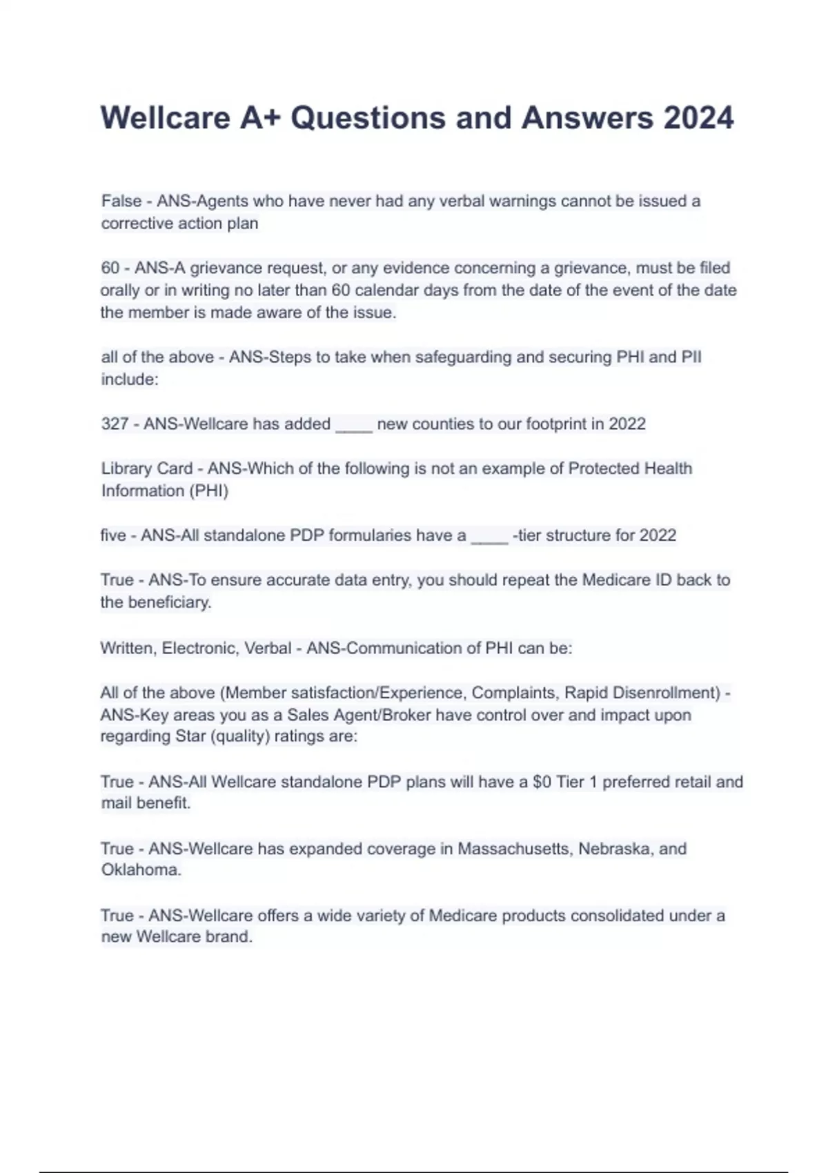 Wellcare A+ Questions and Answers 2024
