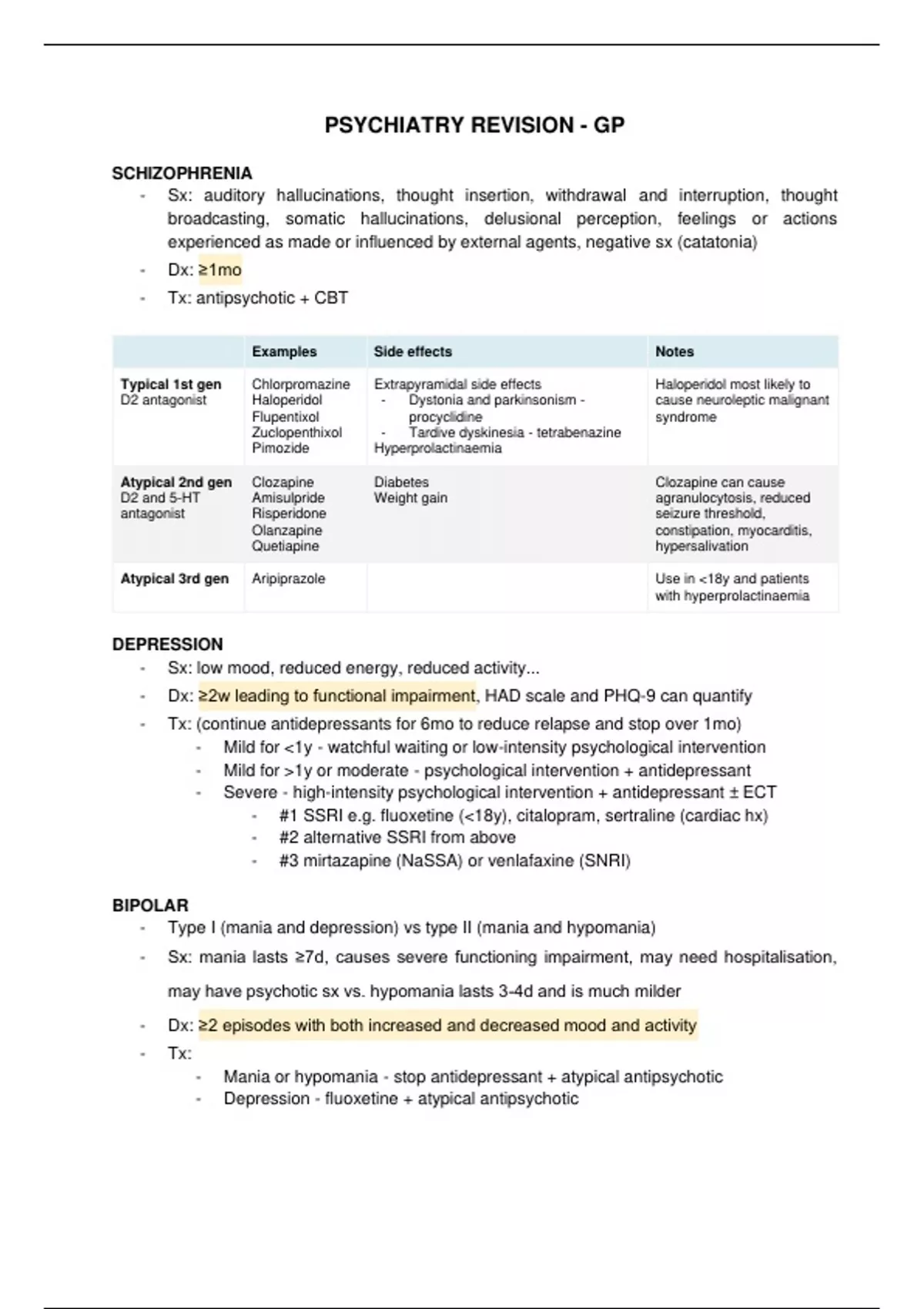 Summary Medical Finals Psychiatry Revision Notes UKMLA