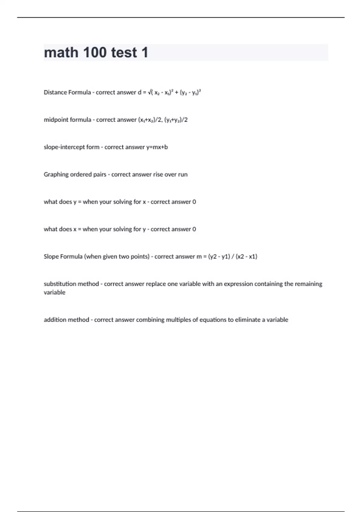 math 100 test 1 Question and answers 100% correct Math 100 Test 1 y-axis symmetry - correct answer x,y and -x,y are on the same graph test by replacing x with -x x-axis symmetry - correct answer x,y and x,-y are on the same graph *not functions since they fail the vertical line test test by replacing y with -y symmetrical about the origin - correct answer x,y and -x,-y are on the same graph test by replacing x with -x and y with -y finding points of intersection - correct answer make the two equations equal each other and solve for the variable slope intercept form - correct answer y=mx+b m=slope b= y-int point-slope form - correct answer y-y1=m(x-x1) y1,x1 is any point on the grap