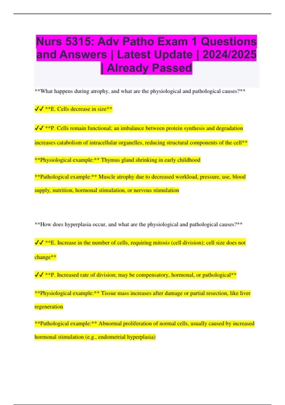 Nurs 5315: Adv Patho Exam 1 Questions and Answers | Latest Update | 2024/2025 | Already Passed **What happens during atrophy, and what are the physiological and pathological causes?** **E. Cells decrease in size** **P. Cells remain functional; an imbalance between protein synthesis and degradation increases catabolism of intracellular organelles, reducing structural components of the cell** **Physiological example:** Thymus gland shrinking in early childhood **Pathological example:** Muscle atrophy due to decreased workload, pressure, use, blood supply, nutrition, hormonal stimulation, or nervous stimulation **How does hyperplasia occur, and what are the physiological and pathological causes?** **E. Increase in the number of cells, requiring mitosis (cell division); cell size does not change** **P. Increased rate of division; may be compensatory, hormonal, or pathological** **Physiological example:** Tissue mass increases after damage or partial resection, like liver regeneration **Pathological example:** Abnormal proliferation of normal cells, usually caused by increased hormonal stimulation (e.g., endometrial hyperplasia) **What characterizes dysplasia, and what are the physiological and pathological examples?** **E. Not true adaptation; cells undergo abnormal changes in size, shape, and organization** **P. Caused by cell injury or irritation, characterized by disordered cell growth, also known as atypical hyperplasia or precancerous changes** **Physiological example:** Not applicable **Pathological example:** Squamous dysplasia of the cervix due to HPV, often detected in Pap smears **What is metaplasia, and what are its physiological and pathological examples?** **E. Reversible change where one type of cell is replaced by another type for survival** **P. Reversible; results from exposure to chronic stressors, injury, or irritation; stimulus induces reprogramming of stem cells under the influence of cytokines and growth factors** **Physiological example:** Barrett's esophagus, where normal squamous cells change to columnar epithelial cells in response to acid reflux **Pathological example:** Normal ciliated epithelial cells in the bronchial lining are replaced by stratified squamous epithelial cells in smokers **What is hypoxia injury, and what are its causes and clinical manifestations?** **E. Inadequate oxygenation of tissues** **P. Decreased mitochondrial function leads to reduced ATP production, increases anaerobic metabolism, and eventual cell death** **Clinical manifestations:** Hypoxia, cyanosis, cognitive impairment, lethargy **What are free radicals and ROS, and what are their impacts?** **E. Normal byproducts of ATP production that can overwhelm mitochondria and exhaust intracellular antioxidants** **P. Cause lipid peroxidation, protein damage, and DNA fragmentation** **Clinical manifestations:** Contribute to the development of conditions like Alzheimer's, heart disease, Parkinson's disease, and Amyotrophic Lateral Sclerosis Ethanol E. mood altering drug, long term effects on liver and nutritional status P. metabolized by liver, generates free radicals C.M. CNS depression, nutrient deficiencies-Mag, Vit B6, thiamine, PO4, inflammation and fatty infiltration of liver, hepatomegaly, leads