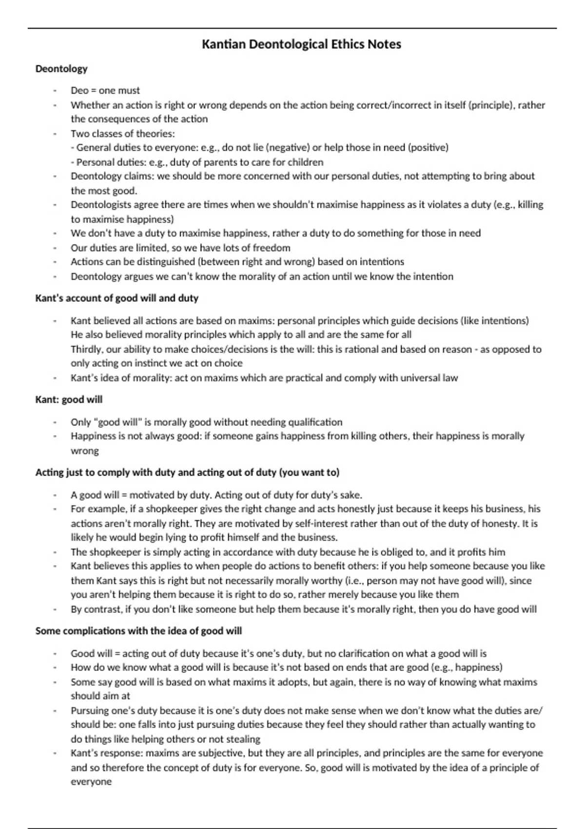 Summary Philosophy A-Level Revision Notes: Kantian Ethics