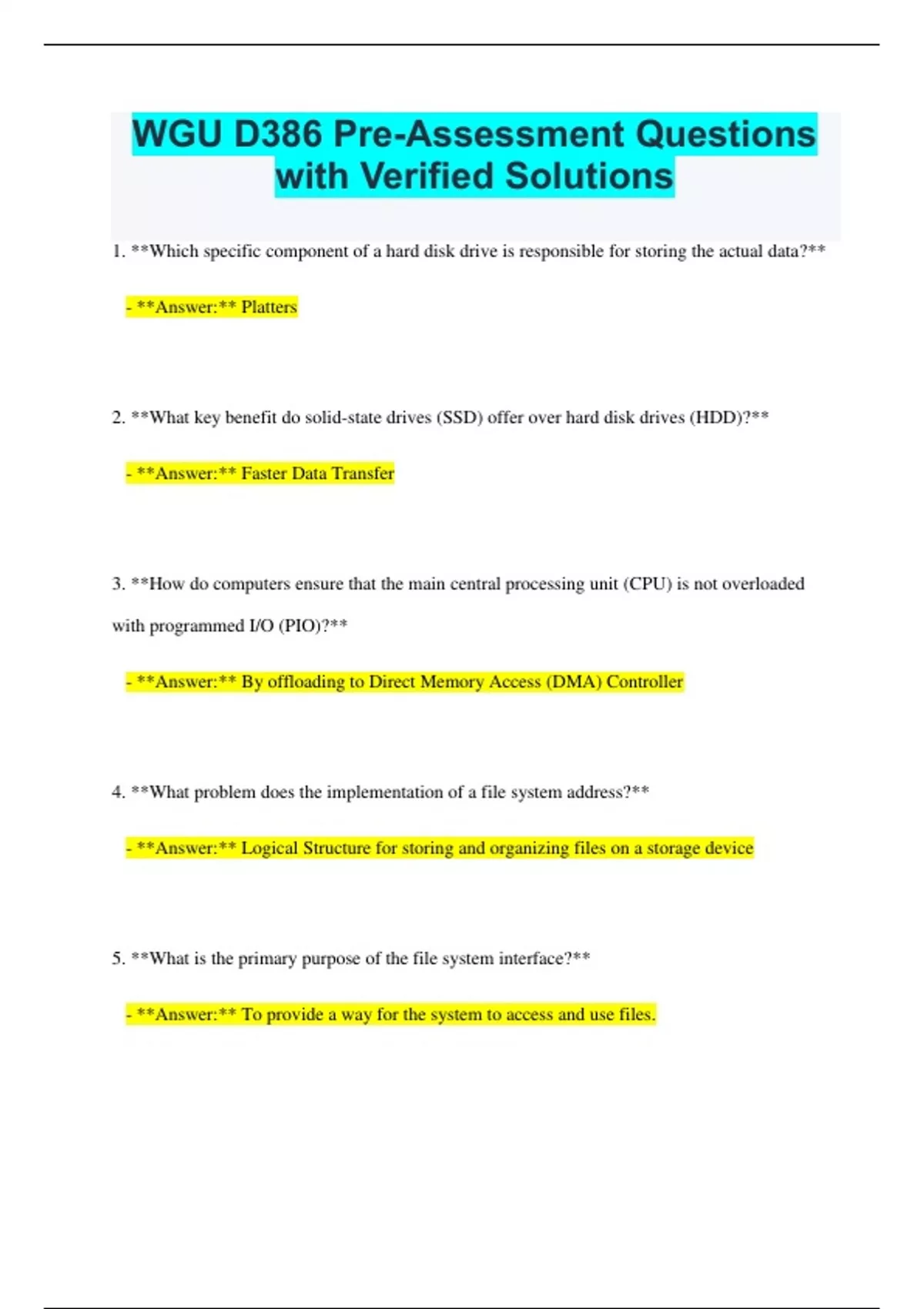 WGU D386 Pre-Assessment Questions with Verified Solutions 1. **Which specific component of a hard disk drive is responsible for storing the actual data?** - **Answer:** Platters 2. **What key benefit do solid-state drives (SSD) offer over hard disk drives (HDD)?** - **Answer:** Faster Data Transfer 3. **How do computers ensure that the main central processing unit (CPU) is not overloaded with programmed I/O (PIO)?** - **Answer:** By offloading to Direct Memory Access (DMA) Controller 4. **What problem does the implementation of a file system address?** - **Answer:** Logical Structure for storing and organizing files on a storage device 5. **What is the primary purpose of the file system interface?** - **Answer:** To provide a way for the system to access and use files. 6. **Among the various components of a motherboard, which one specifically supports slower onboard peripherals?** - **Answer:** Southbridge 7. **Which type of cache memory is the smallest yet fastest?** - **Answer:** L1 8. **Which memory type, stored on a drive, is commonly referred to as a paging file?** - **Answer:** VRAM 9. **Which memory type is notable for its independence from the CPU's external clock?** - **Answer:** Asynchronous DRAM 10. **Which memory type synchronizes with the computer's system-bus clock?** - **Answer:** Synchronous DRAM 11. **What does the operating system primarily utilize to hold its system code and other programs?** - **Answer:** RAM 12. **Can you provide an example of a server operating system?** - **Answer:** Red Hat Enterprise Linux 13. **What essential component of an operating system oversees each process in memory, including decisions on whether to run or wait?** - **Answer:** Process Control Management 14. **Which operating system employs the Bourne-Again shell (bash) scripting tool?** - **Answer:** Linux 15. **Could you cite an example of a system call used by the POSIX API for POSIX-based systems like UNIX, Linux, and macOS?** - **Answer:** Read( )