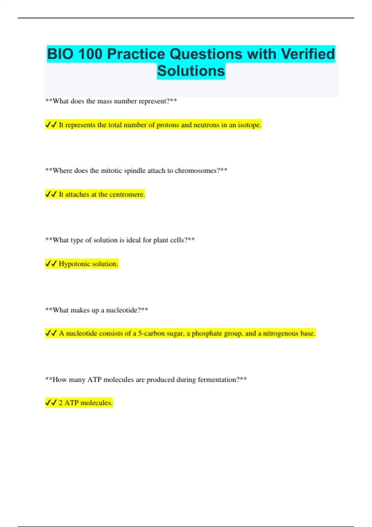 BIO 100 Practice Questions with Verified Solutions **What does the mass number represent?** It represents the total number of protons and neutrons in an isotope. **Where does the mitotic spindle attach to chromosomes?** It attaches at the centromere. **What type of solution is ideal for plant cells?** Hypotonic solution. **What makes up a nucleotide?** A nucleotide consists of a 5-carbon sugar, a phosphate group, and a nitrogenous base. **How many ATP molecules are produced during fermentation?** 2 ATP molecules. **Which virus specifically targets bacteria?** Bacteriophage. **Which mutation type leads to an early stop codon?** Nonsense mutation. **Which pigment does not directly participate in light reactions?** Chlorophyll b. **What is the role of lysosomes in a cell?** Lysosomes digest food and break down harmful molecules. **What is required for a normal cell to turn cancerous?** Genetic mutations leading to uncontrolled cell growth. **What protein structure level includes an alpha helix?** Secondary structure. **Which plants use carbon dioxide from the air for the Calvin Cycle?** C3 plants. **Which is not a product of the light reactions of photosynthesis?** Carbon dioxide. **Which cells do not undergo mitosis?** Sex cells (gametes). **How many ATP molecules are generated in cellular respiration?** 36 ATP molecules. **What is a macromolecule?** A large molecule made up of many atoms, such as proteins, nucleic acids, or synthetic polymers. **What is the correct order of the biological hierarchy?**