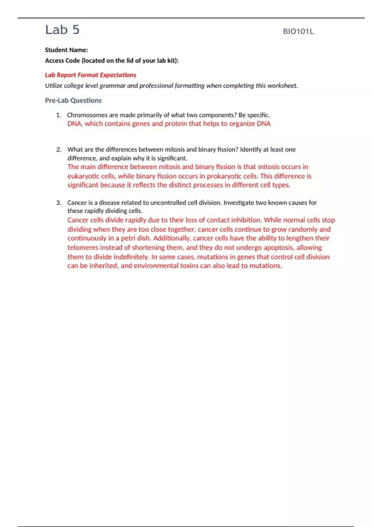 Lab Report Format Expectations Utilize college level grammar and professional formatting when completing this worksheet. Pre-Lab Questions 1. Chromosomes are made primarily of what two components? Be specific. DNA, which contains genes and protein that helps to organize DNA 2. What are the differences between mitosis and binary fission? Identify at least one difference, and explain why it is significant. The main difference between mitosis and binary fission is that mitosis occurs in eukaryotic cells, while binary fission occurs in prokaryotic cells. This difference is significant because it reflects the distinct processes in different cell types. 3. Cancer is a disease related to uncontrolled cell division. Investigate two known causes for these rapidly dividing cells. Cancer cells divide rapidly due to their loss of contact inhibition. While normal cells stop dividing when they are too close together, cancer cells continue to grow randomly and continuously in a petri dish. Additionally, cancer cells have the ability to lengthen their telomeres instead of shortening them, and they do not undergo apoptosis, allowing them to divide indefinitely. In some cases, mutations in genes that control cell division can be inherited, and environmental toxins can also lead to mutations.