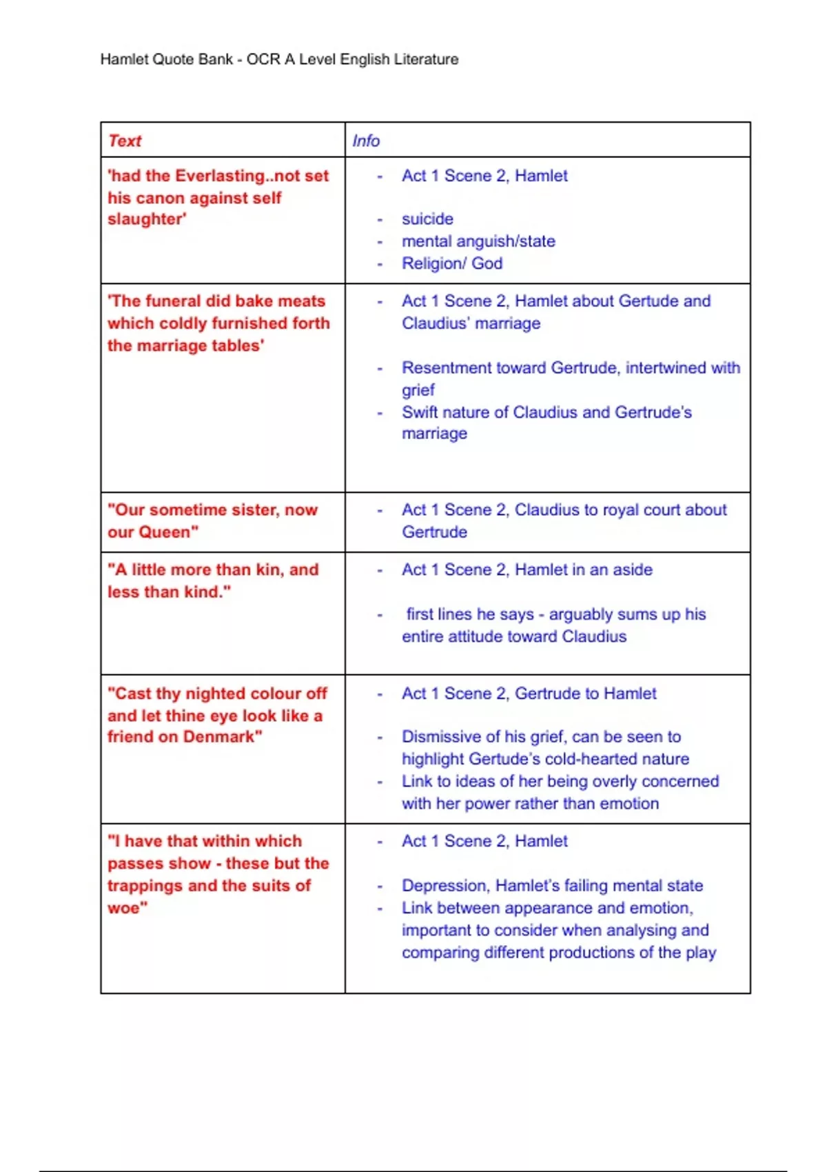 Hamlet Quote Bank - OCR A Level English Literature