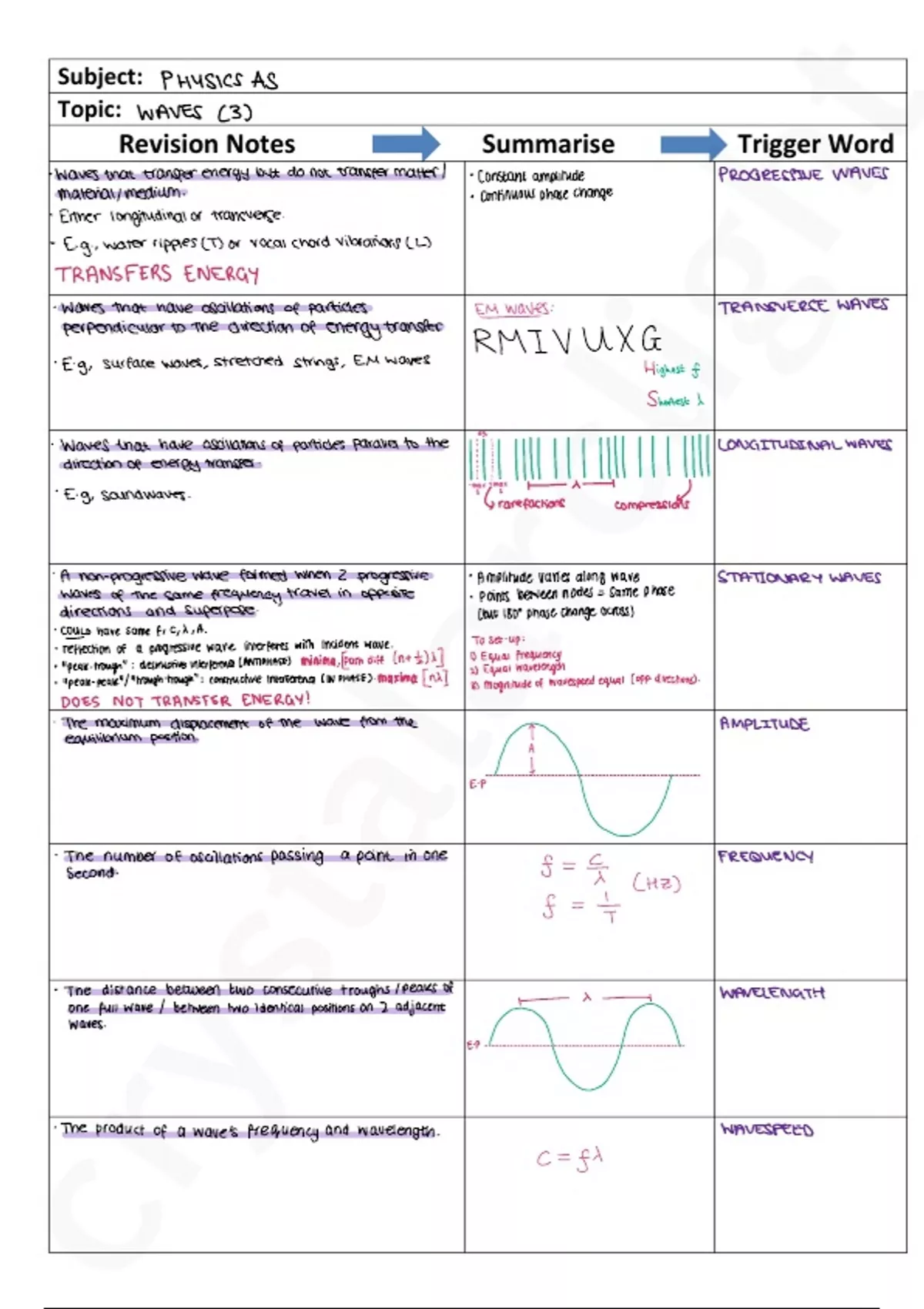 A* level revision trigger word sheet for topic 3, Waves, in AQA A-Level Physics. Covers all content in minimised form, perfect for revision.