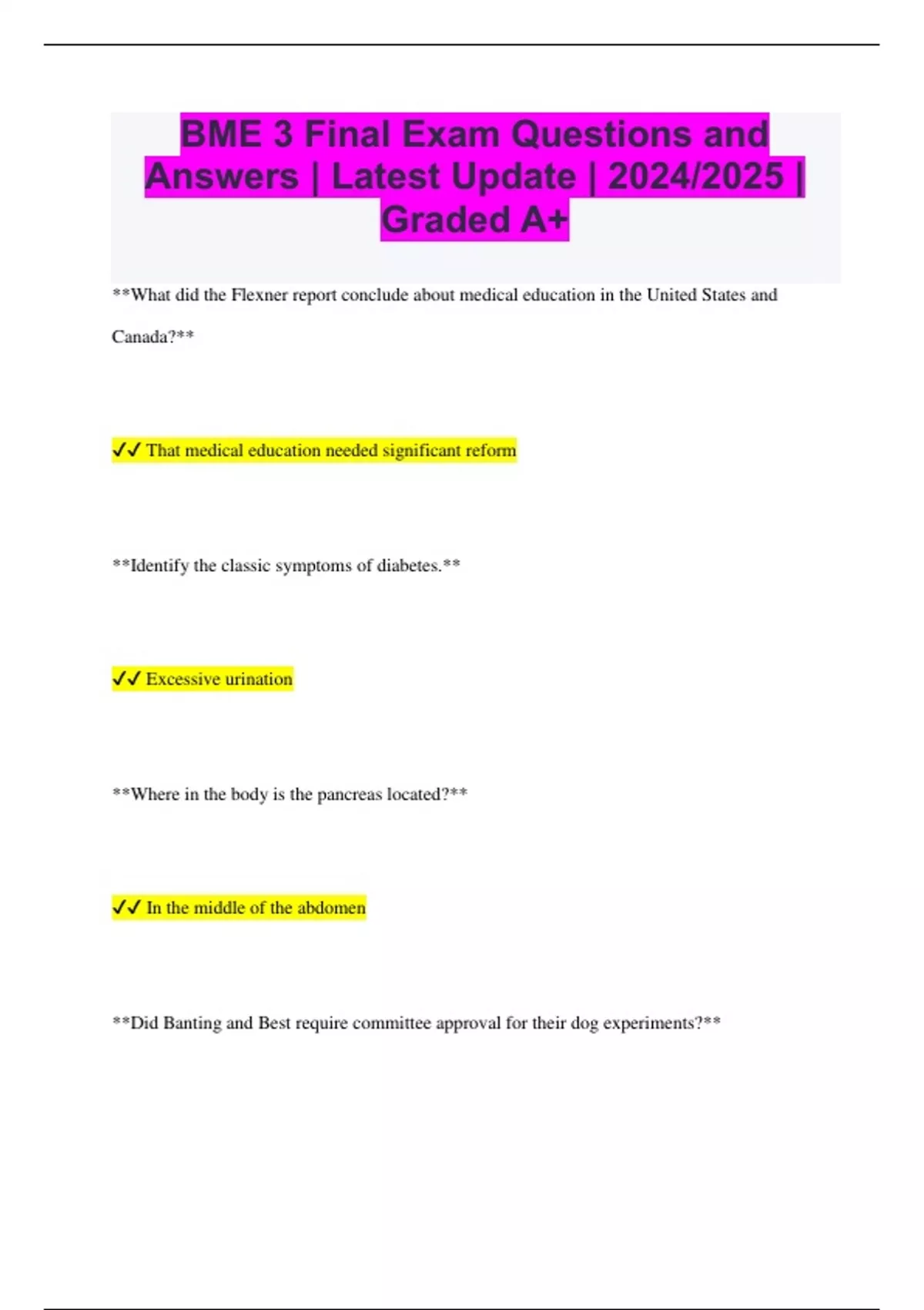 BME 3 Final Exam Questions and Answers | Latest Update | 2024/2025 | Graded A+ **What did the Flexner report conclude about medical education in the United States and Canada?** That medical education needed significant reform **Identify the classic symptoms of diabetes.** Excessive urination **Where in the body is the pancreas located?** In the middle of the abdomen **Did Banting and Best require committee approval for their dog experiments?** False **What does an IACUC (Institutional Animal Care and Use Committee) evaluate in research proposals?** The potential scientific benefits versus the harm caused to animals **What did Fred Banting do immediately after completing his surgical residency at Toronto's Hospital for Sick Children?** He opened his own practice to see patients **When did Fred Banting decide to attend medical school?** After he dropped out of college **How was diabetes first documented?** Independently by many different cultures **What was the primary treatment for diabetes around 1915?** The starvation diet **Where did Fred Banting conduct his dog experiments?** At the University of Toronto **Was Charles Evan Hughes, the US Secretary of State in 1920, diagnosed with diabetes in that year?** False **In 1921, what was the best method for measuring glucose in blood?** By observing the final color of a mixture of blood and some reagents **Could blood glucose levels be measured using an electronic meter around 1920?** False **When did Fred Banting conceive his idea for treating diabetes?** While preparing a lecture for medical students **During his experiments in the summer of 1921, which organ did Fred Banting remove from dogs to induce diabetes?** The pancreas