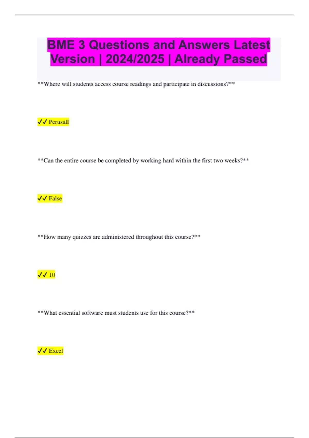 BME 3 Questions and Answers Latest Version | 2024/2025 | Already Passed **Where will students access course readings and participate in discussions?** Perusall **Can the entire course be completed by working hard within the first two weeks?** False **How many quizzes are administered throughout this course?** 10 **What essential software must students use for this course?** Excel **Which factor does not affect a student's final grade?** Attendance **Does an Institutional Animal Care and Use Committee (IACUC) require a minimum of five members, including a veterinarian?** True **What condition was George Minot diagnosed with at the age of 35?** Diabetes **What did the Flexner report suggest about medical education in the United States and Canada?** It required significant reform **What leads to pernicious anemia?** A deficiency in vitamins **How was diabetes first identified historically?** Through independent descriptions by various cultures **Was it possible to measure blood glucose levels with an electronic meter in 1920?** False **Was Charles Evan Hughes, the US Secretary of State in 1920, diagnosed with diabetes during that year?** False **What was the most recommended