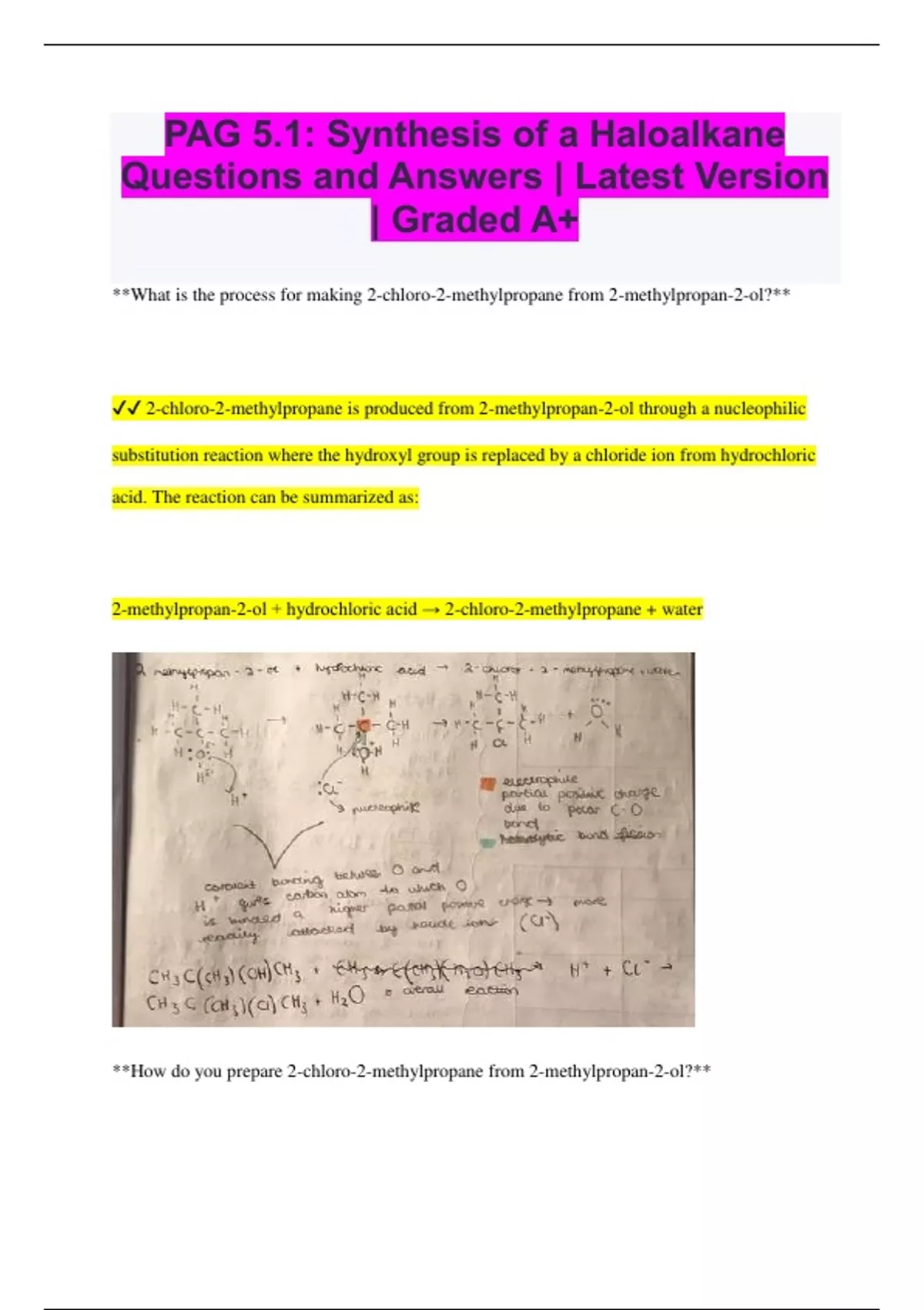 PAG 5.1: Synthesis of a Haloalkane Questions and Answers | Latest Version | Graded A+