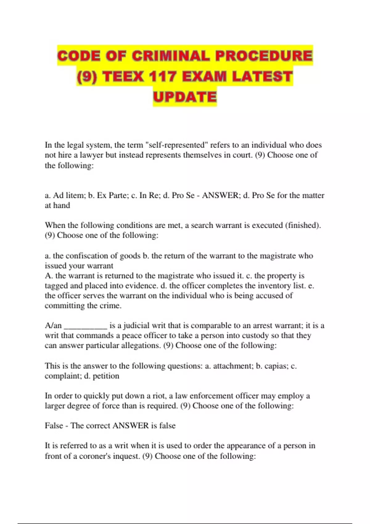 CODE OF CRIMINAL PROCEDURE (9) TEEX 117 EXAM LATEST UPDATE...