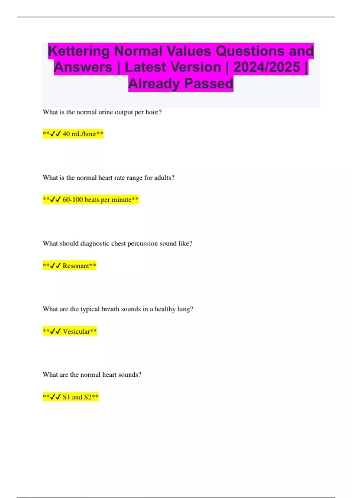 Kettering Normal Values Questions and Answers | Latest Version | 2024/2025 | Already Passed